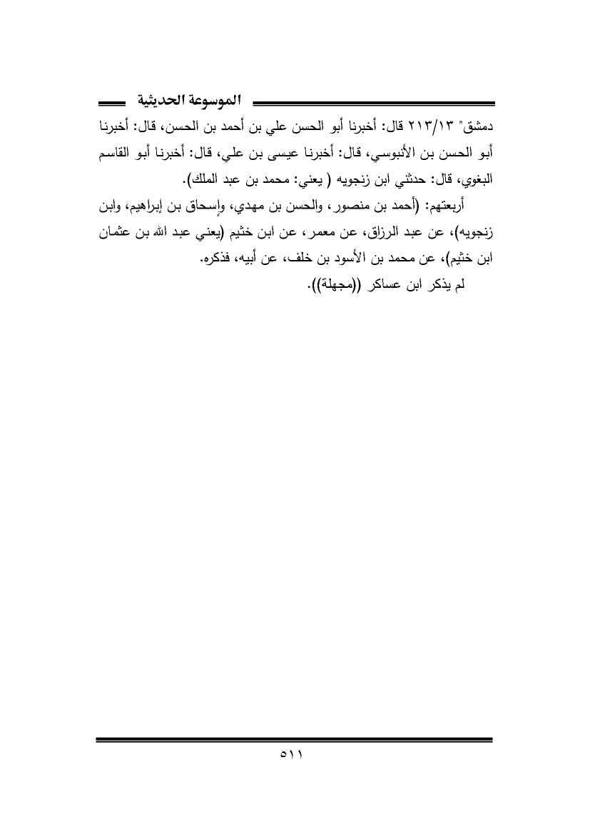 دمشق" ١٣/ ٢١٣ قال: أخبرنا أبو الحسن علي بن أحمد بن الحسن، قال: أخبرنا أبو الحسن بن الأنبوسي، قال: أخبرنا عيسى بن علي، قال: أخبرنا أبو القاسم البغوي، قال: حدثني ابن زنجويه (يعني: محمد بن عبد الملك).