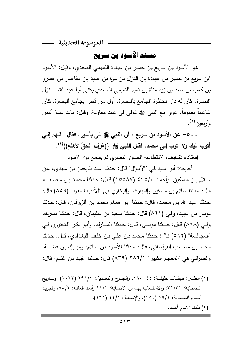 ٥٠٠ - عن الأسود بن سريع، أن النبي -صَلَّى اللهُ عَلَيْهِ وَسَلَّمَ- أتى بأسير، فقال: اللهم إني أتوب إليك ولا أتوب إلى محمد، فقال النبي -صَلَّى اللهُ عَلَيْهِ وَسَلَّمَ-: ((عَرفَ الحق لأهلهِ)) (¬٢).