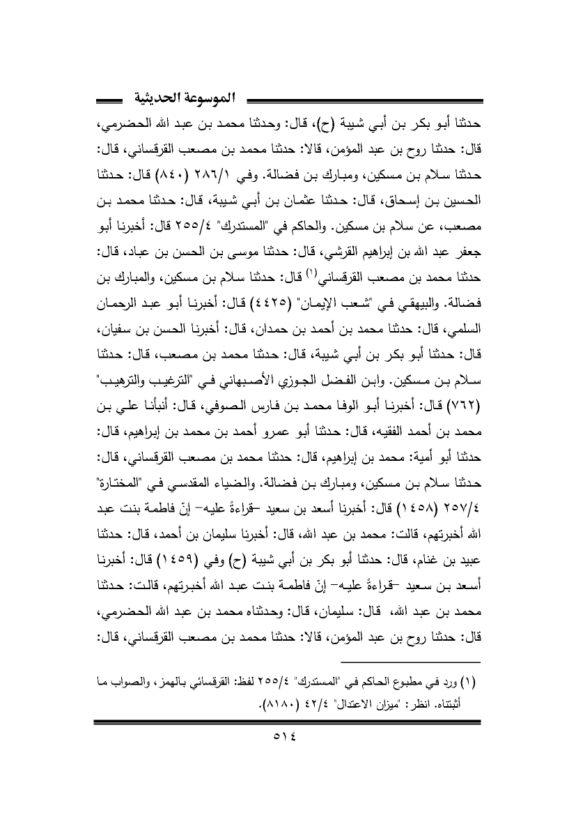 حدثنا أبو بكر بن أبي شيبة (ح)، قال: وحدثنا محمد بن عبد الله الحضرمي، قال: حدثنا روح بن عبد المؤمن، قالا: حدثنا محمد بن مصعب القرقساني، قال: حدثنا سلام بن مسكين، ومبارك بن فضالة. وفي ١/ ٢٨٦ (٤٨٠) قال: حدثنا الحسين بن إسحاق، قال: حدثنا عثمان بن أبي شيبة، قال: حدثنا محمد بن مصعب، عن سلام بن مسكين. والحاكم في "المستدرك" ٤/ ٢٥٥ قال: أخبرنا أبو جعفر عبد الله بن إبراهيم القرشي، قال: حدثنا موسى بن الحسن بن عباد، قال: حدثنا محمد بن مصعب القرقساني (¬١) قال: حدثنا سلام بن مسكين، والمبارك بن فضالة. والبيهقي في "شعب الإيمان" (٤٤٢٥) قال: أخبرنا أبو عبد الرحمان السلمي، قال: حدثنا محمد بن أحمد بن حمدان، قال: أخبرنا الحسن بن سفيان، قال: حدثنا أبو بكر بن أبي شيبة، قال: حدثنا محمد بن مصعب، قال: حدثنا سلام بن مسكين. وابن الفضل الجوزي الأصبهاني في "الترغيب والترهيب" (٧٦٢) قال: أخبرنا أبو الوفا محمد بن فارس الصوفي، قال: أنبأنا علي بن محمد بن أحمد الفقيه، قال: حدثنا أبو عمرو أحمد بن محمد بن إبراهيم، قال: حدثنا أبو أمية: محمد بن إبراهيم، قال: حدثنا محمد بن مصعب القرقساني، قال: حدثنا سلام بن مسكين، ومبارك بن فضالة. والضياء المقدسي في "المختارة" ٤/ ٢٥٧ (١٤٥٨) قال: أخبرنا أسعد بن سعيد -قراءةً عليه- إنّ فاطمة بنت عبد الله أخبرتهم، قالت: محمد بن عبد الله، قال: أخبرنا سليمان بن أحمد، قال: حدثنا عبيد بن غنام، قال: حدثنا أبو بكر بن أبي شيبة (ح) وفي (١٤٥٩) قال: أخبرنا أسعد بن سعيد -قراءةً عليه- إنّ فاطمة بنت عبد الله أخبرتهم، قالت: حدثنا محمد بن عبد الله، قال: سليمان، قال: وحدثناه محمد بن عبد الله الحضرمي، قال: حدثنا روح بن عبد المؤمن، قالا: حدثنا محمد بن مصعب القرقساني، قال: