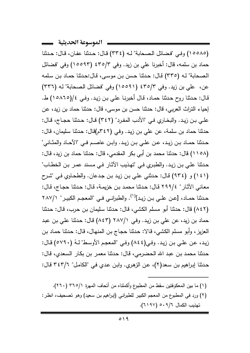 (١٥٥٨٥) وفي "فضائل الصحابة" له (٣٣٤) قال: حدثنا عفان، قال: حدثنا حماد بن سلمة، قال: أخبرنا علي بن زيد. وفي ٣/ ٤٣٥ (١٥٥٩٣) وفي "فضائل الصحابة" له (٣٣٥) قال: حدثنا حسن بن موسى، قال: حدثنا حماد بن سلمة عن علي بن زيد. وفي ٣/ ٤٣٥ (١٥٥٩١) وفي "فضائل الصحابة" له (٣٣٦) قال: حدثنا روح حدثنا حماد، قال أخبرنا علي بن زيد. وفي ٤/ (١٥٨٦٥) ط. إحياء التراث العربي، قال: حدثنا حسن بن موسى، قال: حدثنا حماد بن زيد، عن علي بن زيد. والبخاري في "الأدب المفرد" (٣٤٢) قال: حدثنا حجاج، قال: حدثنا حماد بن سلمة، عن علي بن زيد. وفي (٣٤٢ م) قال: حدثنا سليمان، قال: حدثنا حماد بن زيد، عن علي بن زيد. وابن عاصم في "الآحاد والمثاني" (١١٥٨) قال: حدثنا محمد بن أبي بكر المقدمي، قال: حدثنا حماد بن زيد، قال: حدثنا علي بن زيد. والطبري في "تهذيب الآثار في مسند عمر بن الخطاب" (١٤١) و (٩٣٤) قال: حدثني علي بن زيد بن جدعان. والطحاوي في "شرح معاني الآثار" ٤/ ٢٩٩ قال: حدثنا محمد بن خزيمة، قال: حدثنا حجاج، قال: حدثنا حماد، [عن علي بن زيد] (¬١). والطبراني في "المعجم الكبير" ١/ ٢٨٧ (٨٤٢) قال: حدثنا أبو مسلم الكشي، قال: حدثنا سليمان بن حرب، قال: حدثنا حماد بن زيد، عن علي بن زيد. وفي ١/ ٢٨٧ (٨٤٣) قال: حدثنا علي بن عبد العزيز، وأبو مسلم الكشي، قالا: حدثنا حجاج بن المنهال، قال: حدثنا حماد بن زيد، عن علي بن زيد. وفي (٨٤٤) وفي "المعجم الأوسط" لهُ (٥٧٩٠) قال: حدثنا محمد بن عبد الله الحضرمي، قال: حدثنا معمر بن بكار السعدي، قال: حدثنا إبراهيم بن سعد (¬٢)، عن الزهري. وابن عدي في "الكامل" ٦/ ٣٤٣ قال:
