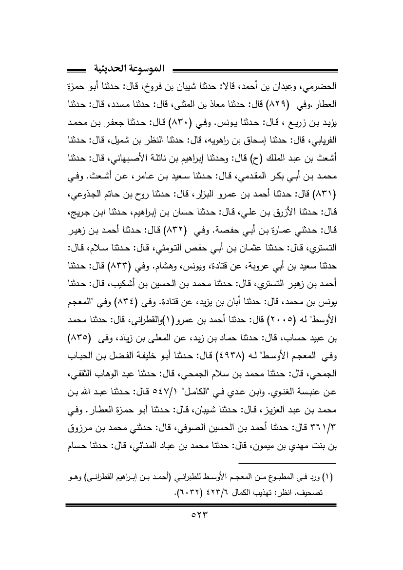 الحضرمي، وعبدان بن أحمد، قالا: حدثنا شيبان بن فروخ، قال: حدثنا أبو حمزة العطار. وفي (٨٢٩) قال: حدثنا معاذ بن المثنى، قال: حدثنا مسدد، قال: حدثنا يزيد بن زريع، قال: حدثنا يونس. وفي (٨٣٠) قال: حدثنا جعفر بن محمد الفريابي، قال: حدثنا إسحاق بن راهويه، قال: حدثنا النظر بن شميل، قال: حدثنا أشعث بن عبد الملك (ح) قال: وحدثنا إبراهيم بن نائلة الأصبهاني، قال: حدثنا محمد بن أبي بكر المقدمي، قال: حدثنا سعيد بن عامر، عن أشعث. وفي (٨٣١) قال: حدثنا أحمد بن عمرو البزار، قال: حدثنا روح بن حاتم الجذوعي، قال: حدثنا الأزرق بن علي، قال: حدثنا حسان بن إبراهيم، حدثنا ابن جريج، قال: حدثني عمارة بن أبي حفصة. وفي (٨٣٢) قال: حدثنا أحمد بن زهير التستري، قال: حدثنا عثمان بن أبي حفص التومئي، قال: حدثنا سلام، قال: حدثنا سعيد بن أبي عروبة، عن قتادة، ويونس، وهشام. وفي (٨٣٣) قال: حدثنا أحمد بن زهير التستري، قال: حدثنا محمد بن الحسين بن أشكيب، قال: حدثنا يونس بن محمد، قال: حدثنا أبان بن يزيد، عن قتادة. وفي (٨٣٤) وفي "المعجم الأوسط" له (٢٠٠٥) قال: حدثنا أحمد بن عمرو (¬١) والقطراني، قال: حدثنا محمد بن عبيد حساب، قال: حدثنا حماد بن زيد، عن المعلى بن زياد، وفي (٨٣٥) وفي "المعجم الأوسط" له (٤٩٣٨) قال: حدثنا أبو خليفة الفضل بن الحباب الجمحي، قال: حدثنا محمد بن سلام الجمحي، قال: حدثنا عبد الوهاب الثقفي، عن عنبسة الغنوي. وابن عدي في "الكامل" ١/ ٥٤٧ قال: حدثنا عبد الله بن محمد بن عبد العزيز، قال: حدثنا شيبان، قال: حدثنا أبو حمزة العطار. وفي ٣/ ٣٦١ قال: حدثنا أحمد بن الحسين الصوفي، قال: حدثني محمد بن مرزوق بن بنت مهدي بن ميمون، قال: حدثنا محمد بن عباد المنائي، قال: حدثنا حسام