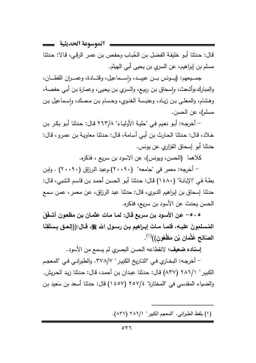 ٥٠٥ - عن الأسود بن سريع قال: لما مات عثمان بن مظعون أشفَقَ المُسلمِونَ عليهِ، فلما ماتَ إبراهيم بن رسول الله -صلى الله عليه وسلم-، قال: "إلحق بِسَلَفِنَا الصّالحِ عُثْمان بْن مَظْعُونٍ" (¬١).