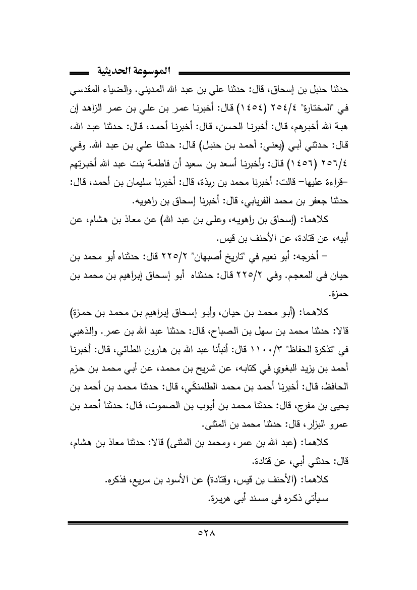 كلاهما: (إسحاق بن راهويه، وعلي بن عبد الله) عن معاذ بن هشام، عن أبيه، عن قتادة، عن الأحنف بن قيس.