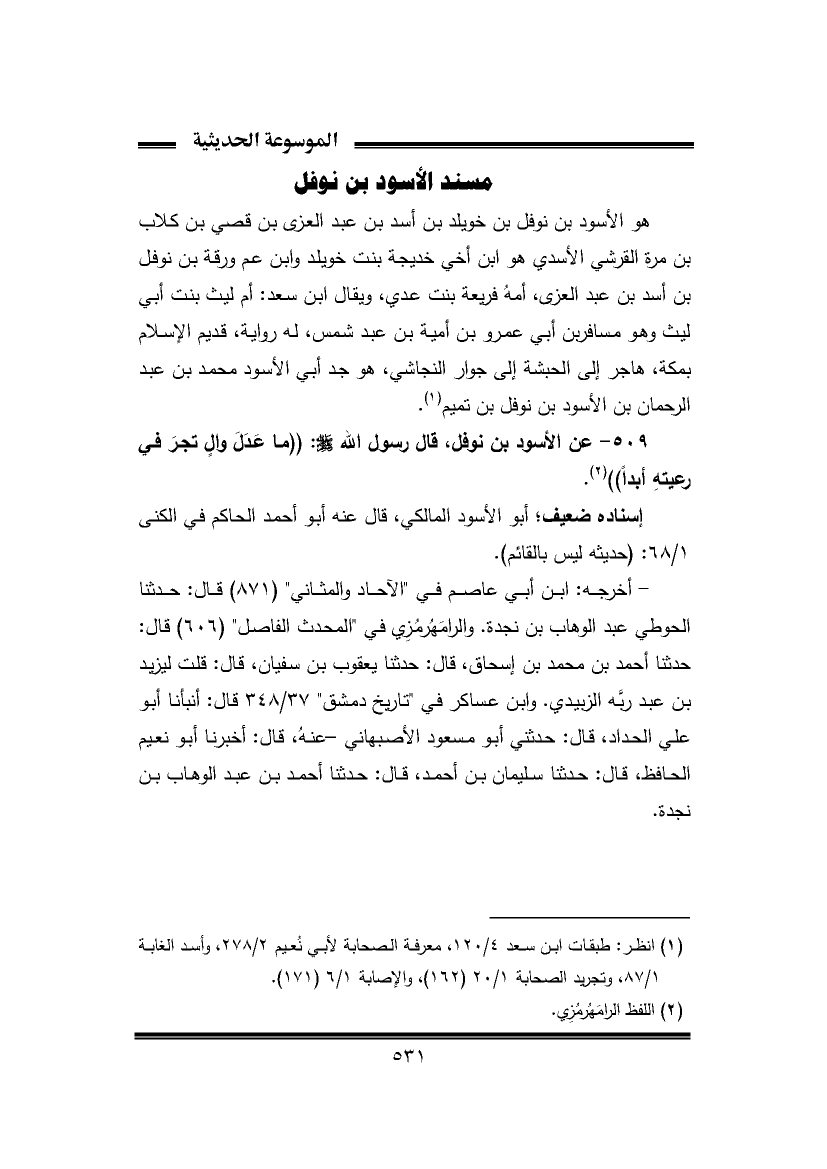٥٠٩ - عن الأسود بن نوفل، قال رسول الله -صلى الله عليه وسلم-: "ما عَدَلَ والٍ تجرَ في رعيتهِ أبدًا" (¬٢).