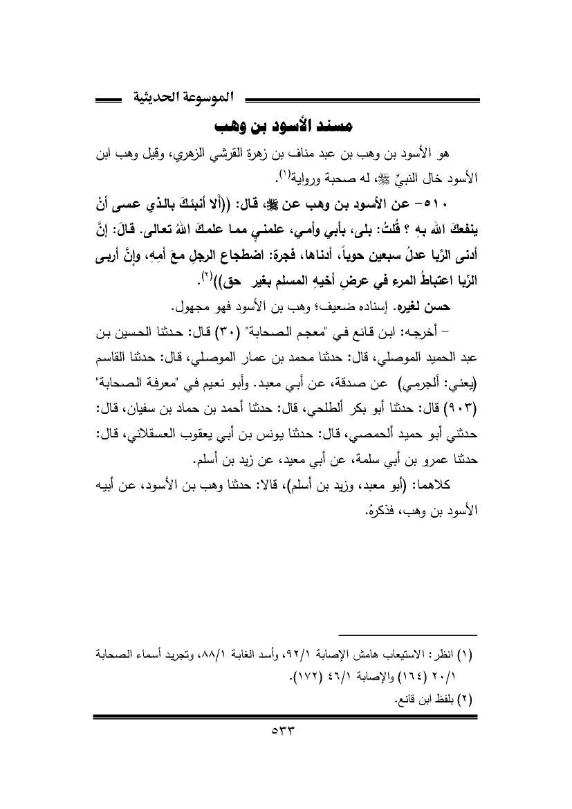 ٥١٠ - عن الأسود بن وهب عن -صلى الله عليه وسلم-، قال: "أَلا أنبئكَ بالذي عسى أنْ ينفعكَ الله بهِ؟ قُلتُ: بلى، بأبي وأمي، علمنيٍ مما علمكَ الله تعالى. قالَ: إنَّ أدنى الرِّبا عدلُ سبعين حوبًا، أدناها، فجرة: اضطجاع الرجلِ معَ أمِهِ، وإنَّ أربى الرِّبا اعتباطُ المرء في عرضِ أخيهِ المسلم بغير حق" (¬٢).
