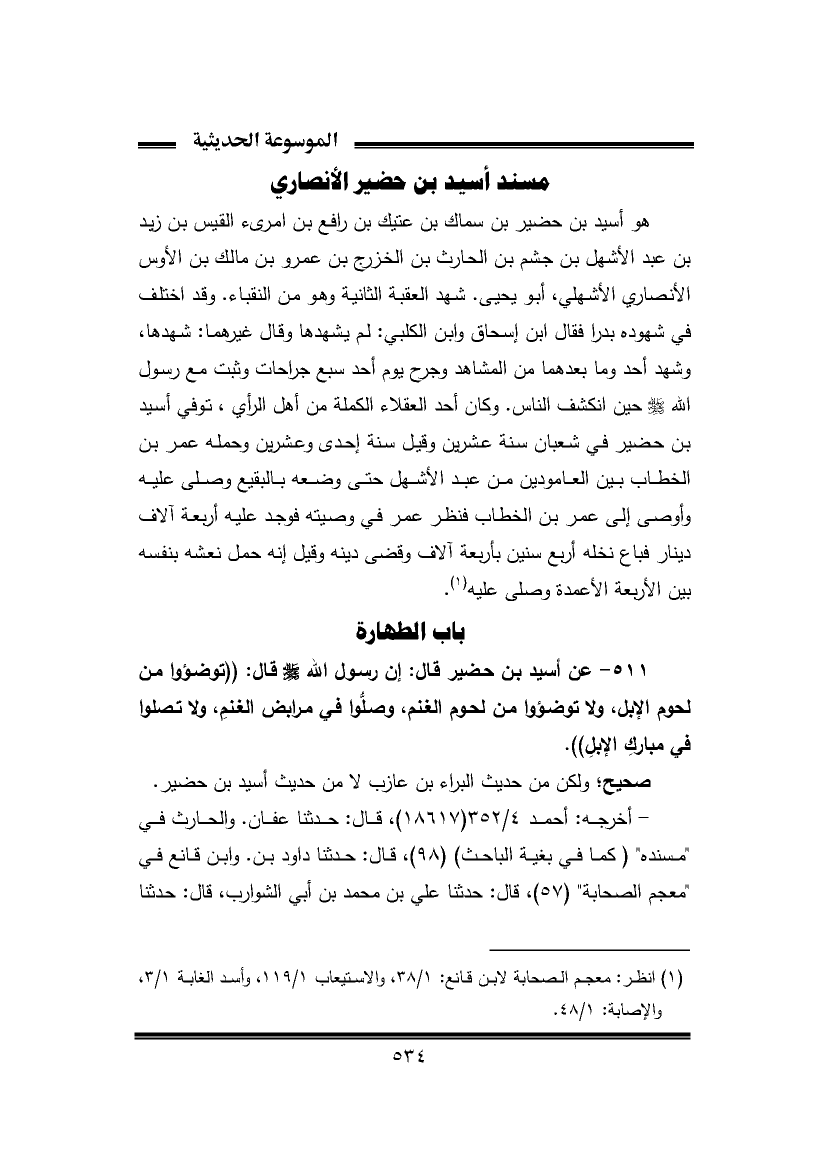٥١١ - عن أسيد بن حضير قال: إن رسول الله -صلى الله عليه وسلم- قال: "توضؤوا من لحوم الإبل، ولا توضؤوا من لحوم الغنم، وصلُّوا في مرابض الغنمِ، ولا تصلوا في مباركِ الإبلِ".