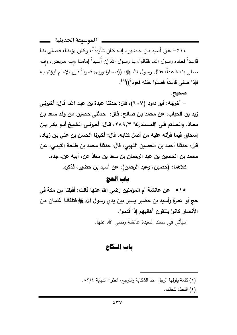 ٥١٤ - عن أسيد بن حضير، إنه كان تأوه (¬١)، وكان يؤمنا، فصلى بنا قاعدًا فعاده رسول الله، فقالوا، يا رسول الله إن أُسيدًا إمامنا وإنه مريض، وإنه صلى بنا قاعدًا، فقال رسول الله -صلى الله عليه وسلم-: "فصلوا وراءه قعودًا فإن الإمام ليؤتم به فإذا صلى قاعدًا فصلوا خلفه قعودًا" (¬٢).