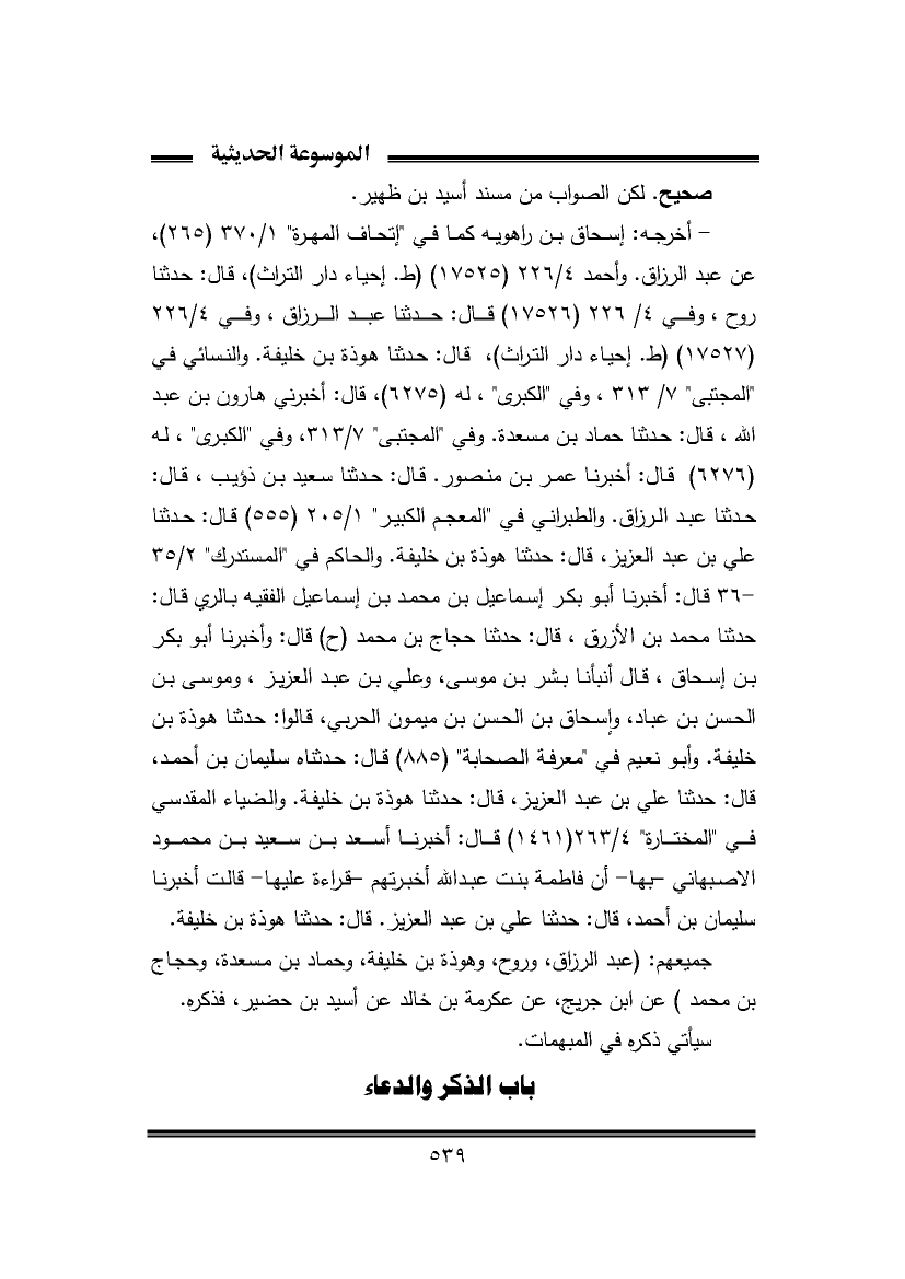 جميعهم: (عبد الرزاق، وروح، وهوذة بن خليفة، وحماد بن مسعدة، وحجاج بن محمد) عن ابن جريج، عن عكرمة بن خالد عن أسيد بن حضير، فذكره.