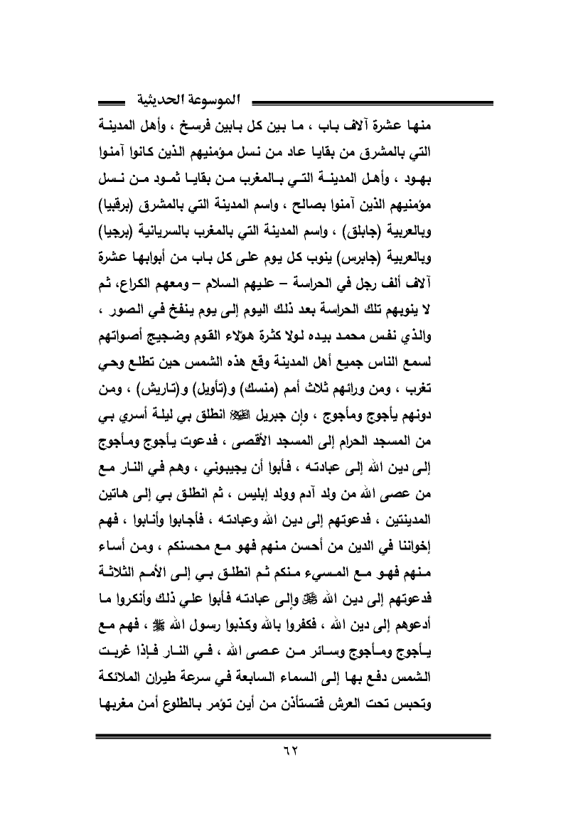 منها عشرة آلاف باب، ما بين كل بابين فرسخ، وأهل المدينة التي بالمشرق من بقايا عاد من نسل مؤمنيهم الذين كانوا آمنوا بهود، وأهل المدينة التي بالمغرب من بقايا ثمود من نسل مؤمنيهم الذين آمنوا بصالح، واسم المدينة التي بالمشرق (برقبيا) ويالعربية (جابلق)، واسم المدينة التي بالمغرب بالسريانية (برجيا) وبالعربية (جابرس) ينوب كل يوم على كل باب من أبوابها عشرة آلاف ألف رجل في الحراسة - عليهم السلام - ومعهم الكراع، ثم لا ينوبهم تلك الحراسة بعد ذلك اليوم إلى يوم ينفخ في الصور، والذي نفس محمد بيده لولا كثرة هؤلاء القوم وضجيج أصواتهم لسمع الناس جميع أهل المدينة وقع هذه الشمس حين تطلع وحي تغرب، ومن ورائهم ثلاث أمم (منسك) و (تأويل) و (تاريش)، ومن دونهم يأجوج ومأجوج، وإن جبريل عَلِيْه السَّلام انطلق بي ليلة أسري بي من المسجد الحرام إلى المسجد الأقصى، فدعوت يأجوج ومأجوج إلى دين الله إلى عبادته، فأبوا أن يجيبوني، وهم في النار مع من عصى الله من ولد آدم وولد إبليس، ثم انطلق بي إلى هاتين المدينتين، فدعوتهم إلى دين الله وعبادته، فاجابوا وأنابوا، فهم إخواننا في الدين من أحسن منهم فهو مع محسنكم، ومن أساء منهم فهو مع المسيء منكم ثم انطلق بي إلى الأمم الثلاثة فدعوتهم إلى دين الله عزَّ وجلَّ وإلى عبادته فأبوا علي ذلك وأنكروا ما أدعوهم إلى دين الله، فكفروا بالله وكذبوا رسول الله - صلى الله عليه وسلم -، فهم مع يأجوج ومأجوج وسائر من عصى الله، في النار فإذا غربت الشمس دفع بها إلى السماء السابعة في سرعة طيران الملائكة وتحبس تحت العرش فتستأذن من أين تؤمر بالطلوع أمن مغربها