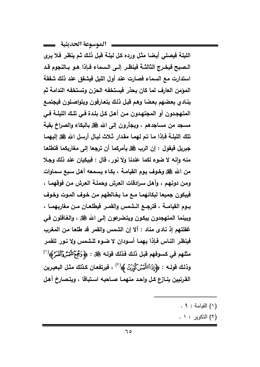 الليلة فيصلي أيضا مثل ورده كل ليلة قبل ذلك ثم ينظر فلا يرى الصبح فيخرج الثالثة فينظر إلى السماء فإذا هو بالنجوم قد استدارت مع السماء فصارت عند أول الليل فيشفق عند ذلك شفقة المؤمن العارف لما كان يحذر فيستخفه الحزن وتستخفه الندامة ثم ينادي بعضهم بعضا وهم قبل ذلك يتعارفون ويتواصلون فيجتمع المتهجدون أو المجتهدون من أهل كل بلدة في تلك الليلة في مسجد من مساجدهم، ويجأرون إلى الله عزَّ وجلَّ بالبكاء والصراخ بقية تلك الليلة فإذا ما تم لهما مقدار ثلاث ليال أرسل الله عزَّ وجلَّ إليهما جبريل فيقول: إن الرب عزَّ وجلَّ يأمركما أن ترجعا إلى مغاربكما فتطلعا منه وإنه لا ضوء لكما عندنا ولا نور، قال: فيبكيان عند ذلك وجلا من الله عزَّ وجلَّ وخوف يوم القيامة، بكاء يسمعه أهل سبع سماوات ومن دونهم، وأهل سرادقات العرش وحملة العرش من فوقهما، فيبكون جميعا لبكائهما مع ما يخالطهم من خوف الموت وخوف يوم القيامة، فترجع الشمس والقمر فيطلعان من مغاربهما، وبينما المتهجدون يبكون ويتضرعون إلى الله عزَّ وجلَّ، والغافلون في غفلتهم إذ نادى مناد: ألا إن الشمس والقمر قد طلعا من المغرب فينظر الناس فإذا بهما أسودان لا ضوء للشمس ولا نور للقمر مثلهم في كسوفهم قبل ذلك فذلك قوله عزَّ وجلَّ: {وَجُمِعَ الشَّمْسُ وَالْقَمَرُ} (¬١) وذلك قوله: {إِذَا الشَّمْسُ كُوِّرَتْ} (¬٢)، فيرتفعان كذلك مثل البعيرين