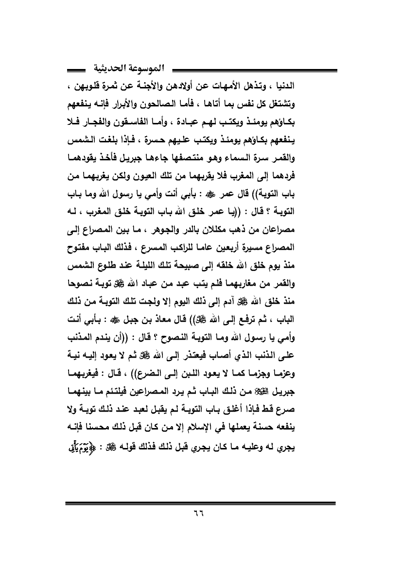 الدنيا، وتذهل الأمهات عن أولادهن والأجنة عن ثمرة قلوبهن، وتشتغل كل نفس بما أتاها، فأما الصالحون والأبرار فإنه ينفعهم بكاؤهم يومئذ ويكتب لهم عبادة، وأما الفاسقون والفجار فلا ينفعهم بكاؤهم يومئذ ويكتب عليهم حسرة، فإذا بلغت الشمس والقمر سرة السماء وهو منتصفها جاءها جبريل فأخذ يقودهما فردهما إلى المغرب فلا يقربهما من تلك العيون ولكن يغربهما من باب التوبة" قال عمر - رضي الله عنه -: بأبي أنت وأمي يا رسول الله وما باب التوبة؟ قال: "يا عمر خلق الله باب التوبة خلق المغرب، له مصراعان من ذهب مكللان بالدر والجوهر، ما بين المصراع إلى المصراع مسيرة أربعين عاما للراكب المسرع، فذلك الباب مفتوح منذ يوم خلق الله خلقه إلى صبيحة تلك الليلة عند طلوع الشمس والقمر من مغاربهما فلم يتب عبد من عباد الله عزَّ وجلَّ توبة نصوحا منذ خلق الله عزَّ وجلَّ آدم إلى ذلك اليوم إلا ولجت تلك التوبة من ذلك الباب، ثم ترفع إلى الله عزَّ وجلَّ" قال معاذ بن جبل - رضي الله عنه -: بأبي أنت وأمي يا رسول الله وما التوبة النصوح؟ قال: "أن يندم المذنب على الذنب الذي أصاب فيعتذر إلى الله عزَّ وجلَّ ثم لا يعود إليه نية وعزما وجزما كما لا يعود اللبن إلى الضرع"، قال: فيغربهما جبريل عَلِيْه السَّلام من ذلك الباب ثم يرد المصراعين فيلتئم ما بينهما صرع قط فإذا أغلق باب التوبة لم يقبل لعبد عند ذلك توبة ولا ينفعه حسنة يعملها في الإسم إلا من كان قبل ذلك محسنا فإنه يجري له وعليه ما كان يجري قبل ذلك فذلك قوله عزَّ وجلَّ: {يَوْمَ يَأْتِي