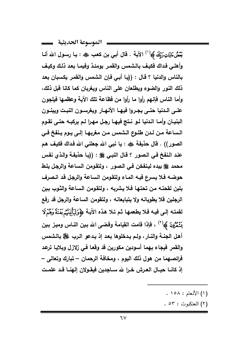 بَعْضُ آيَاتِ رَبِّكَ} (¬١) الآية. قال أبي بن كعب - رضي الله عنه -: يا رسول الله أنا وأهلي فداك فكيف بالشمس والقمر يومئذ وفيما بعد ذلك وكيف بالناس والدنيا؟ قال: "يا أبي فإن الشمس والقمر يكسبان بعد ذلك النور والضوء ويطلعان على الناس ويغربان كما كانا قبل ذلك، وأما الناس فإنهم رأوا ما رأوا من فظاعة تلك الآية وعظمها فيلجون على الدنيا حتى يجروا فيها الأنهار ويغرسون النبت ويبنون البنيان وأما الدنيا لو نتج فيها رجل مهرا لم يركبه حتى تقوم الساعة من لدن طلوع الشمس من مغربها إلى يوم ينفخ في الصور". قال حذيفة - رضي الله عنه -: يا نبي الله جعلني الله فداك فكيف هم عند النفخ في الصور؟ قال النبي - صلى الله عليه وسلم -: "يا حذيفة والذي نفس محمد - صلى الله عليه وسلم - بيده لينفخن في الصور، ولتقومن الساعة والرجل يلط حوضه فلا يسرع فيه الماء ولتقومن الساعة والرجل قد انصرف بلبن لقحته من تحتها فلا يشربه، ولتقومن الساعة والثوب بين الرجلين فلا يطويانه ولا يتبايعانه، ولتقومن الساعة والرجل قد رفع لقمته إلى فيه فلا يطعمها ثم تلا هذه الآية {وَلَيَأْتِيَنَّهُمْ بَغْتَةً وَهُمْ لَا يَشْعُرُونَ} (¬٢)، فإذا قامت القيامة وقضى الله بين الناس وميز بين أهل الجنة والنار، ولم يدخلوها بعد إذ يدعو الرب جل جلاله بالشمس والقمر فيجاء بهما أسودين مكورين قد وقعا في زلازل وبلايا ترعد فرائصهما من هول ذلك اليوم، ومخافة الرحمان - تبارك وتعالى - إذ كانا حيال العرش خرا لله ساجدين فيقولان إلهنا قد علمت