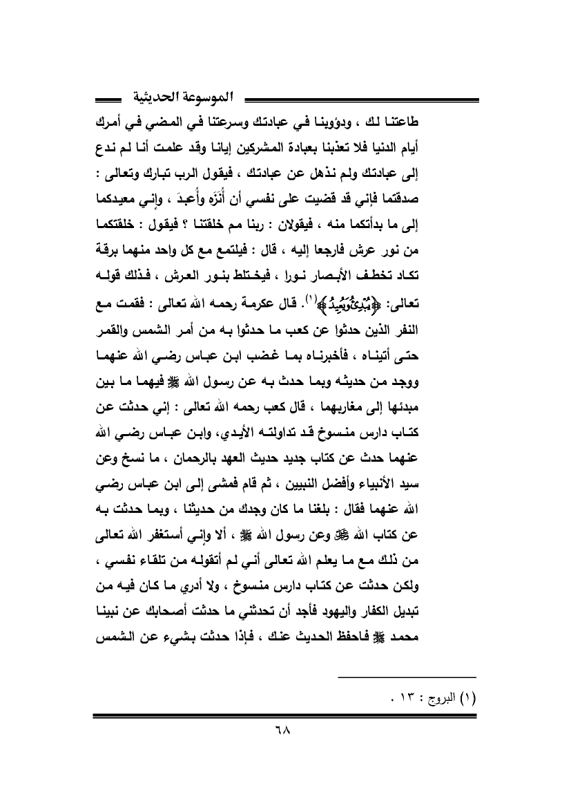 طاعتنا لك، ودؤوبنا في عبادتك وسرعتنا في المضي في أمرك أيام الدنيا فلا تعذبنا بعبادة المشركين إيانا وقد علمت أنا لم ندع إلى عبادتك ولم نذهل عن عبادتك، فيقول الرب تبارك وتعالى: صدقتما فإني قد قضيت على نفسي أن أُنَزَه وأُعبدَ، وإني معيدكما إلى ما بدأتكما منه، فيقولان: ربنا مم خلقتنا؟ فيقول: خلقتكما من نور عرش فارجعا إليه، قال: فيلتمع مع كل واحد منهما برقة تكاد تخطف الأبصار نورا، فيختلط بنور العرش، فذلك قوله تعالى: {يُبْدِئُ وَيُعِيدُ} (١). قال عكرمة رحمه الله تعالى: فقمت مع النفر الذين حدثوا عن كعب ما حدثوا به من أمر الشمس والقمر حتى أتيناه، فأخبرناه بما غضب ابن عباس رضي الله عنهما ووجد من حديثه ويما حدث به عن رسول الله - صلى الله عليه وسلم - فيهما ما بين مبدئها إلى مغاربهما، قال كعب رحمه الله تعالى: إني حدثت عن كتاب دارس منسوخ قد تداولته الأيدي، وابن عباس رضي الله عنهما حدث عن كتاب جديد حديت العهد بالرحمان، ما نسخ وعن سيد الأنبياء وأفضل النبيين، ثم قام فمشى إلى ابن عباس رضي الله عنهما فقال: بلغنا ما كان وجدك من حديثنا، ويما حدثت به عن كتاب الله عزَّ وجلَّ وعن رسول الله - صلى الله عليه وسلم -، ألا وإني أستغفر الله تعالى من ذلك مع ما يعلم الله تعالى أني لم أتقوله من تلقاء نفسي، ولكن حدثت عن كتاب دارس منسوخ، ولا أدري ما كان فيه من تبديل الكفار واليهود فأجد أن تحدثني ما حدثت أصحابك عن نبينا محمد - صلى الله عليه وسلم - فاحفظ الحديث عنك، فإذا حدثت بشيء عن الشمس