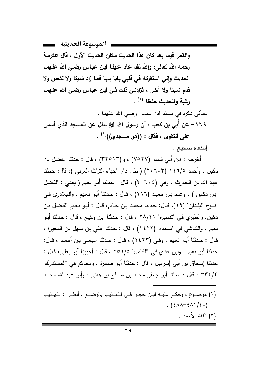 ١٦٩ - عن أُبي بن كعب، أن رسول الله - صلى الله عليه وسلم - سئل عن المسجد الذي أسس على التقوى، فقال: "هو مسجدي" (¬٢).