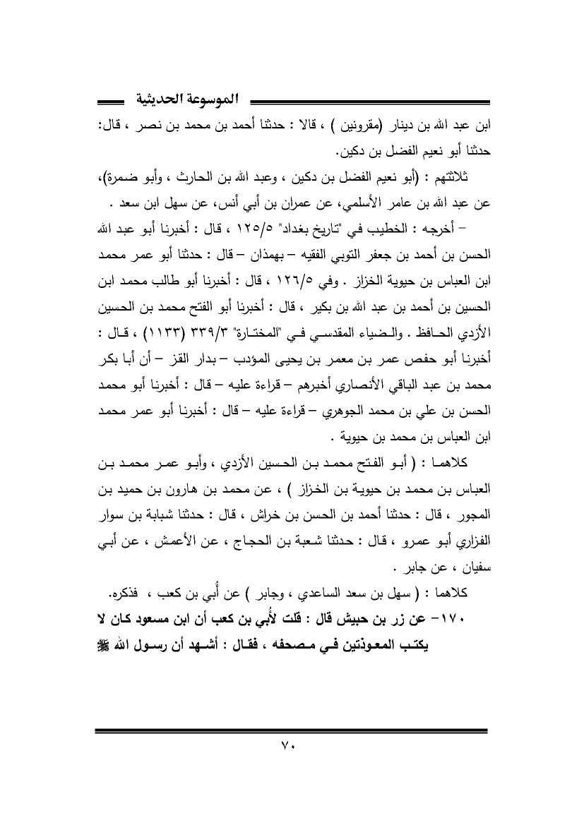 ١٧٠ - عن زر بن حبيش قال: قلت لأُبي بن كعب أن ابن مسعود كان لا يكتب المعوذتين في مصحفه، فقال: أشهد أن رسول الله - صلى الله عليه وسلم -
