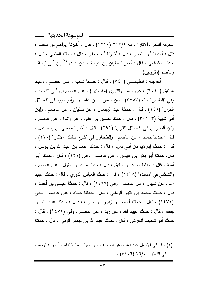 - أخرجه: الطيالسي (٥٤١)، قال: حدثنا شعبة، عن عاصم. وعبد الرزاق (٦٠٤٠)، عن معمر والثوري (مقرونين)، عن عاصم بن أبي النجود. وفي "التفسير"، له (٣٧٥٣)، عن معمر، عن عاصم. وأبو عبيد في "فضائل القرآن" (١٤٦)، قال: حدثنا عبد الرحمان، عن سفيان، عن عاصم. وابن أبي شيبة (٣٠١٩٣)، قال: حدثنا حسين بن علي، عن زائدة، عن عاصم. وابن الضريس في "فضائل القرآن" (٢٩١)، قال: أخبرنا موسى بن إسماعيل، قال: حدثنا حماد، عن عاصم. والطحاوي في "شرح مشكل الآثار" (١٢٠)، قال: حدثنا إبراهيم بن أبي داود، قال: حدثنا أحمد بن عبد الله بن يونس، قال: حدثنا أبو بكر بن عياش، عن عاصم. وفي (١٢١)، قال: حدثنا أبو أمية، قال: حدثنا محمد بن سابق، قال: حدثنا مالك بن مغول، عن عاصم. والشاشي في "مسنده" (١٤٦٨)، قال: حدثنا العباس الدوري، قال: حدثنا عبيد الله، عن شيبان، عن عاصم. وفي (١٤٦٩)، قال: حدثنا عيسى بن أحمد، قال: حدثنا محمد بن كثير الرملي، قال: حدثنا حماد، عن عاصم. وفي (١٤٧١)، قال: حدثنا أحمد بن زهير بن حرب، قال: حدثنا عبد الله بن جعفر، قال: حدثنا عبيد الله، عن زيد، عن عاصم. وفي (١٤٧٢)، قال: حدثنا أبو شعيب الحراني، قال: حدثنا عبد الله بن جعفر الرقي، قال: حدثنا