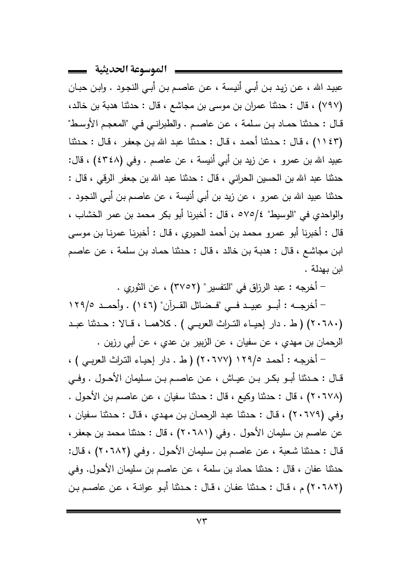 عبيد الله، عن زيد بن أبي أنيسة، عن عاصم بن أبي النجود. وابن حبان (٧٩٧)، قال: حدثنا عمران بن موسى بن مجاشع، قال: حدثنا هدبة بن خالد، قال: حدثنا حماد بن سلمة، عن عاصم. والطبراني في "المعجم الأوسط" (١١٤٣)، قال: حدثنا أحمد، قال: حدثنا عبد الله بن جعفر، قال: حدثنا عبيد الله بن عمرو، عن زيد بن أبي أنيسة، عن عاصم. وفي (٤٣٤٨)، قال: حدثنا عبد الله بن الحسين الحراني، قال: حدثنا عبد الله بن جعفر الرقي، قال: حدثنا عبيد الله بن عمرو، عن زيد بن أبي أنيسة، عن عاصم بن أبي النجود. والواحدي في "الوسيط" ٤/ ٥٧٥، قال: أخبرنا أبو بكر محمد بن عمر الخشاب، قال: أخبرنا أبو عمرو محمد بن أحمد الحيري، قال: أخبرنا عمرنا بن موسى بن مجاشع، قال: هدبة بن خالد، قال: حدثنا حماد بن سلمة، عن عاصم بن بهدلة.