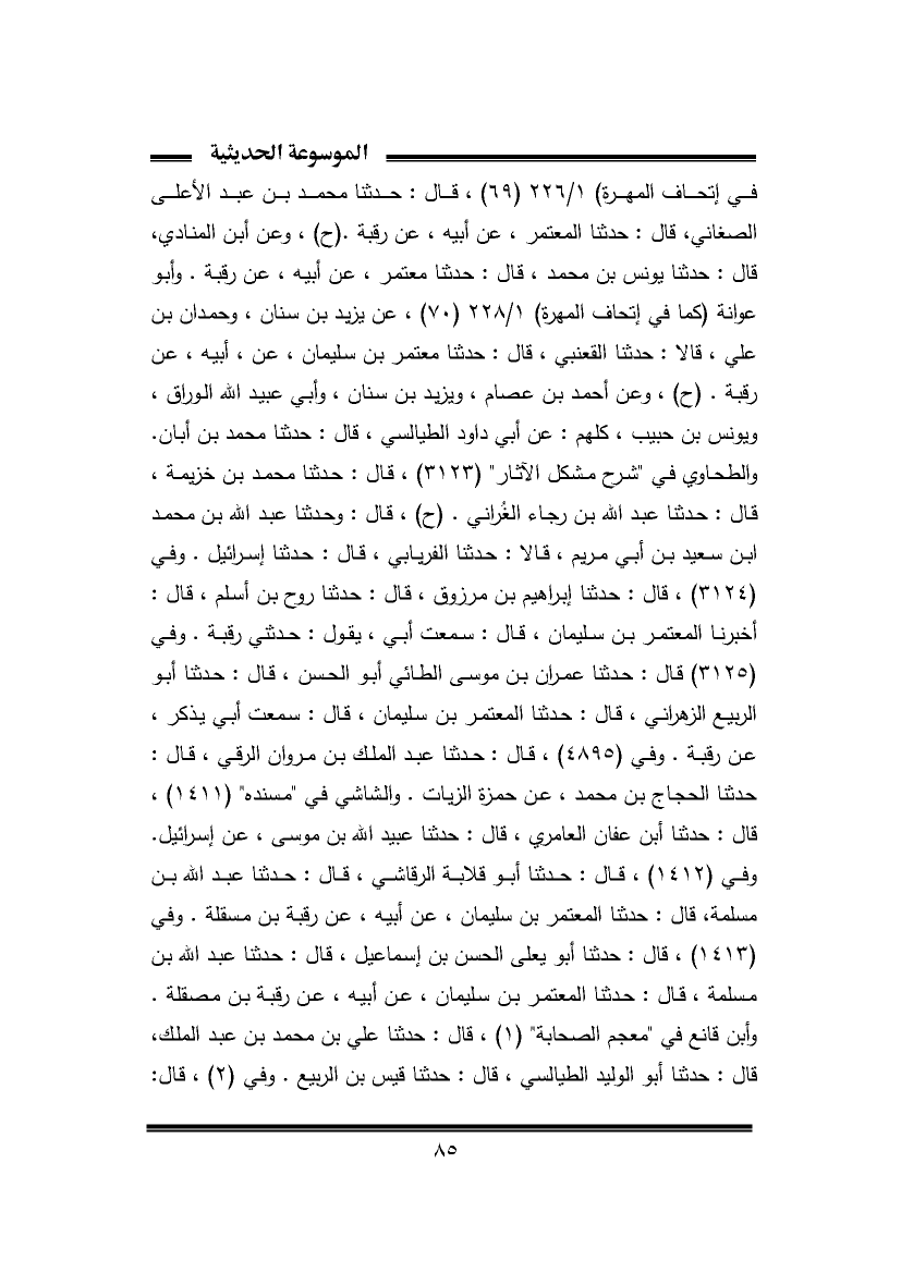 في إتحاف المهرة) ١/ ٢٢٦ (٦٩)، قال: حدثنا محمد بن عبد الأعلى الصغاني، قال: حدثنا المعتمر، عن أبيه، عن رقبة. (ح)، وعن ابن المنادي، قال: حدثنا يونس بن محمد، قال: حدثنا معتمر، عن أبيه، عن رقبة. وأبو عوانة (كما في إتحاف المهرة) ١/ ٢٢٨ (٧٠)، عن يزيد بن سنان، وحمدان بن علي، قالا: حدثنا القعنبي، قال: حدثنا معتمر بن سليمان، عن، أبيه، عن رقبة. (ح)، وعن أحمد بن عصام، ويزيد بن سنان، وأبي عبيد الله الوراق، ويونس بن حبيب، كلهم: عن أبي داود الطيالسي، قال: حدثنا محمد بن أبان. والطحاوي في "شرح مشكل الآثار" (٣١٢٣)، قال: حدثنا محمد بن خزيمة، قال: حدثنا عبد الله بن رجاء الغُراني. (ح)، قال: وحدثنا عبد الله بن محمد بن سعيد بن أبي مريم، قالا: حدثنا الفريابي، قال: حدثنا إسرائيل. وفي (٣١٢٤)، قال: حدثنا إبراهيم بن مرزوق، قال: حدثنا روح بن أسلم، قال: أخبرنا المعتمر بن سليمان، قال: سمعت أبي، يقول: حدثني رقبة. وفي (٣١٢٥) قال: حدثنا عمران بن موسى الطائي أبو الحسن، قال: حدثنا أبو الربيع الزهراني، قال: حدثنا المعتمر بن سليمان، قال: سمعت أبي يذكر، عن رقبة. وفي (٤٨٩٥)، قال: حدثنا عبد الملك بن مروان الرقي، قال: حدثنا الحجاج بن محمد، عن حمزة الزيات. والشاشي في "مسنده" (١٤١١)، قال: حدثنا ابن عفان العامري، قال: حدثنا عبيد الله بن موسى، عن إسرائيل. وفي (١٤١٢)، قال: حدثنا أبو قلابة الرقاشي، قال: حدثنا عبد الله بن مسلمة، قال: حدثنا المعتمر بن سليمان، عن أبيه، عن رقبة بن مسقلة. وفي (١٤١٣)، قال: حدثنا أبو يعلى الحسن بن إسماعيل، قال: حدثنا عبد الله بن مسلمة، قال: حدثنا المعتمر بن سليمان، عن أبيه، عن رقبة بن مصقلة. وابن قانع في "معجم الصحابة" (١)، قال: حدثنا علي بن محمد بن عبد الملك، قال: حدثنا أبو الوليد الطيالسي، قال: حدثنا قيس بن الربيع. وفي (٢)، قال: