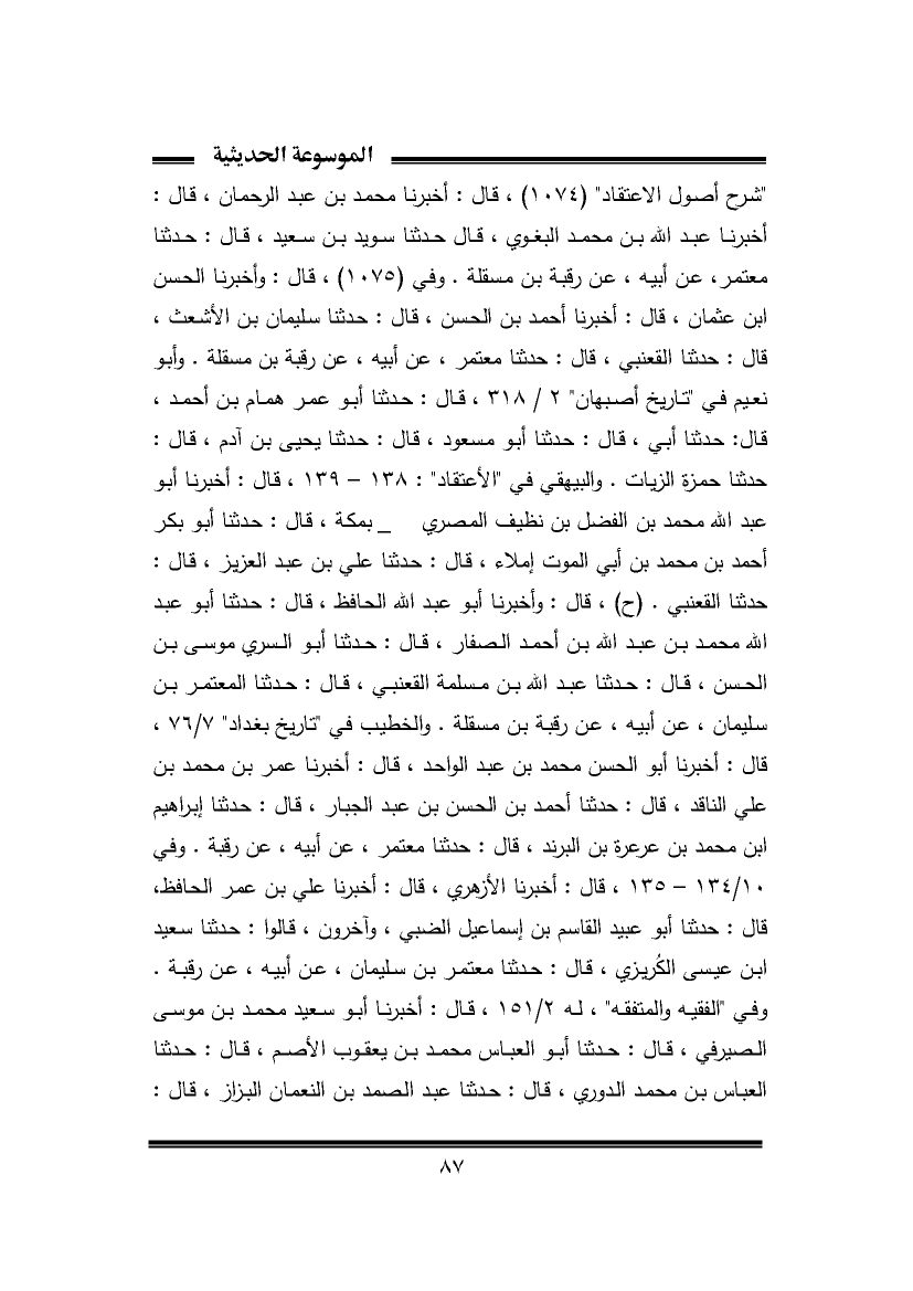 "شرح أصول الاعتماد" (١٠٧٤)، قال: أخبرنا محمد بن عبد الرحمان، قال: أخبرنا عبد الله بن محمد البغوي، قال حدثنا سويد بن سعيد، قال: حدثنا معتمر، عن أبيه، عن رقبة بن مسقلة. وفي (١٠٧٥)، قال: وأخبرنا الحسن بن عثمان، قال: أخبرنا أحمد بن الحسن، قال: حدثنا سليمان بن الأشعث، قال: حدثنا القعنبي، قال: حدثنا معتمر، عن أبيه، عن رقبة بن مسقلة. وأبو نعيم في "تاريخ أصبهان" ٢/ ٣١٨، قال: حدثنا أبو عمر همام بن أحمد، قال: حدثنا أبي، قال: حدثنا أبو مسعود، قال: حدثنا يحيى بن آدم، قال: حدثنا حمزة الزيات. والبيهقي في "الاعتماد": ١٣٨ - ١٣٩، قال: أخبرنا أبو عبد الله محمد بن الفضل بن نظيف المصري - بمكة، قال: حدثنا أبو بكر أحمد بن محمد بن أبي الموت إملاء، قال: حدثنا علي بن عبد العزيز، قال: حدثنا القعنبي. (ح)، قال: وأخبرنا أبو عبد الله الحافظ، قال: حدثنا أبو عبد الله محمد بن عبد الله بن أحمد الصفار، قال: حدثنا أبو السري موسى بن الحسن، قال: حدثنا عبد الله بن مسلمة القعنبي، قال: حدثنا المعتمر بن سليمان، عن أبيه، عن رقبة بن مسقلة. والخطيب في "تاريخ بغداد" ٧/ ٧٦، قال: أخبرنا أبو الحسن محمد بن عبد الواحد، قال: أخبرنا عمر بن محمد بن علي الناقد، قال: حدثنا أحمد بن الحسن بن عبد الجبار، قال: حدثنا إبراهيم بن محمد بن عرعرة بن البرند، قال: حدثنا معتمر، عن أبيه، عن رقبة. وفي ١٠/ ١٣٤ - ١٣٥، قال: أخبرنا الأزهري، قال: أخبرنا علي بن عمر الحافظ، قال: حدثنا أبو عبيد القاسم بن إسماعيل الضبي، وآخرون، قالوا: حدثنا سعيد بن عيسى الكُريزي، قال: حدثنا معتمر بن سليمان، عن أبيه، عن رقبة. وفي "الفقيه والمتفقه"، له ٢/ ١٥١، قال: أخبرنا أبو سعيد محمد بن موسى الصيرفي، قال: حدثنا أبو العباس محمد بن يعقوب الأصم، قال: حدثنا العباس بن محمد الدوري، قال: حدثنا عبد الصمد بن النعمان البزاز، قال: