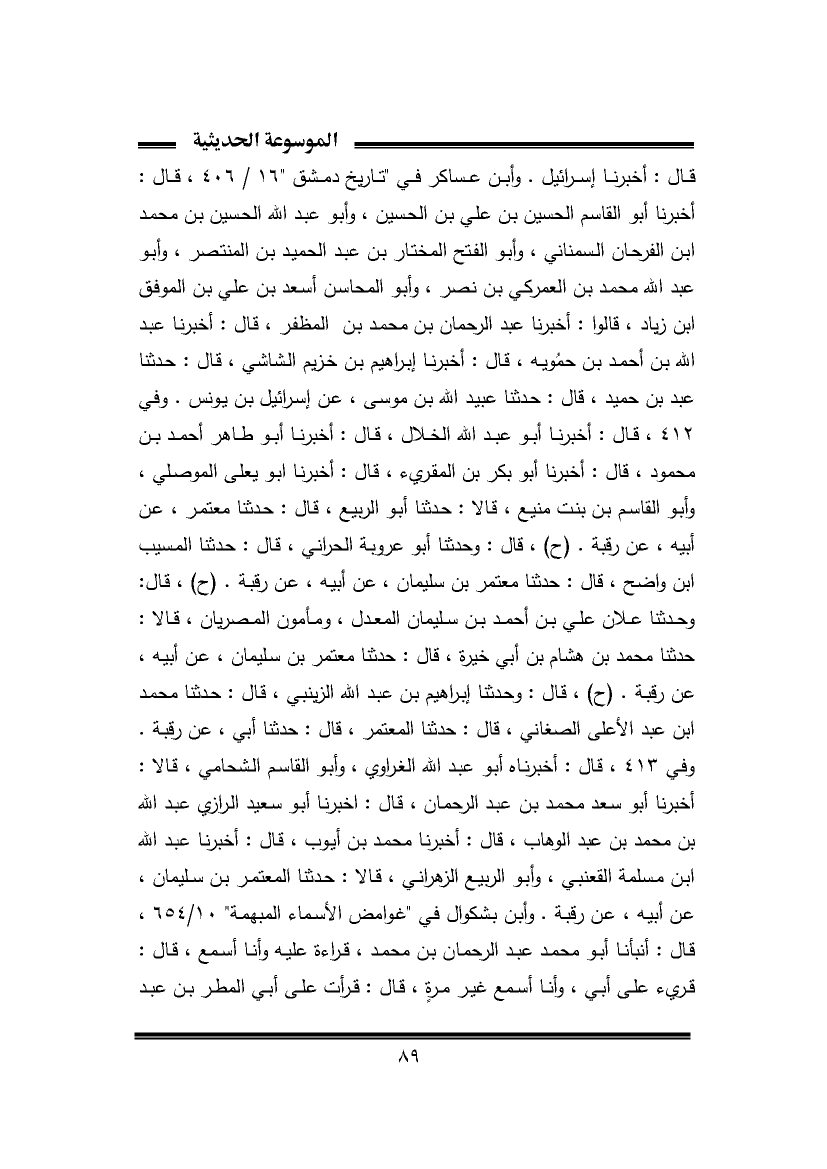 قال: أخبرنا إسرائيل. وابن عساكر في "تاريخ دمشق" ١٦/ ٤٠٦، قال: أخبرنا أبو القاسم الحسين بن علي بن الحسين، وأبو عبد الله الحسين بن محمد بن الفرحان السمناني، وأبو الفتح المختار بن عبد الحميد بن المنتصر، وأبو عبد الله محمد بن العمركي بن نصر، وأبو المحاسن أسعد بن علي بن الموفق بن زياد، قالوا: أخبرنا عبد الرحمان بن محمد بن المظفر، قال: أخبرنا عبد الله بن أحمد بن حمُويه، قال: أخبرنا إبراهيم بن خزيم الشاشي، قال: حدثنا عبد بن حميد، قال: حدثنا عبيد الله بن موسى، عن إسرائيل بن يونس. وفي ٤١٢، قال: أخبرنا أبو عبد الله الخلال، قال: أخبرنا أبو طاهر أحمد بن محمود، قال: أخبرنا أبو بكر بن المقريء، قال: أخبرنا أبو يعلى الموصلي، وأبو القاسم بن بنت منيع، قالا: حدثنا أبو الربيع، قال: حدثنا معتمر، عن أبيه، عن رقبة. (ح)، قال: وحدثنا أبو عروبة الحراني، قال: حدثنا المسيب بن واضح، قال: حدثنا معتمر بن سليمان، عن أبيه، عن رقبة. (ح)، قال: وحدثنا علان علي بن أحمد بن سليمان المعدل، ومأمون المصريان، قالا: حدثنا محمد بن هشام بن أبي خيرة، قال: حدثنا معتمر بن سليمان، عن أبيه، عن رقبة. (ح)، قال: وحدثنا إبراهيم بن عبد الله الزينبي، قال: حدثنا محمد بن عبد الأعلى الصغاني، قال: حدثنا المعتمر، قال: حدثنا أبي، عن رقبة. وفي ٤١٣، قال: أخبرناه أبو عبد الله الغراوي، وأبو القاسم الشحامي، قالا: أخبرنا أبو سعد محمد بن عبد الرحمان، قال: اخبرنا أبو سعيد الرازي عبد الله بن محمد بن عبد الوهاب، قال: أخبرنا محمد بن أيوب، قال: أخبرنا عبد الله بن مسلمة القعنبي، وأبو الربيع الزهراني، قالا: حدثنا المعتمر بن سليمان، عن أبيه، عن رقبة. وابن بشكوال في "غوامض الأسماء المبهمة"، ١٠/ ٦٥٤، قال: أنبأنا أبو محمد عبد الرحمان بن محمد، قراءة عليه وأنا أسمع، قال: قريء على أبي، وأنا أسمع غير مرةٍ، قال: قرأت على أبي المطر بن عبد