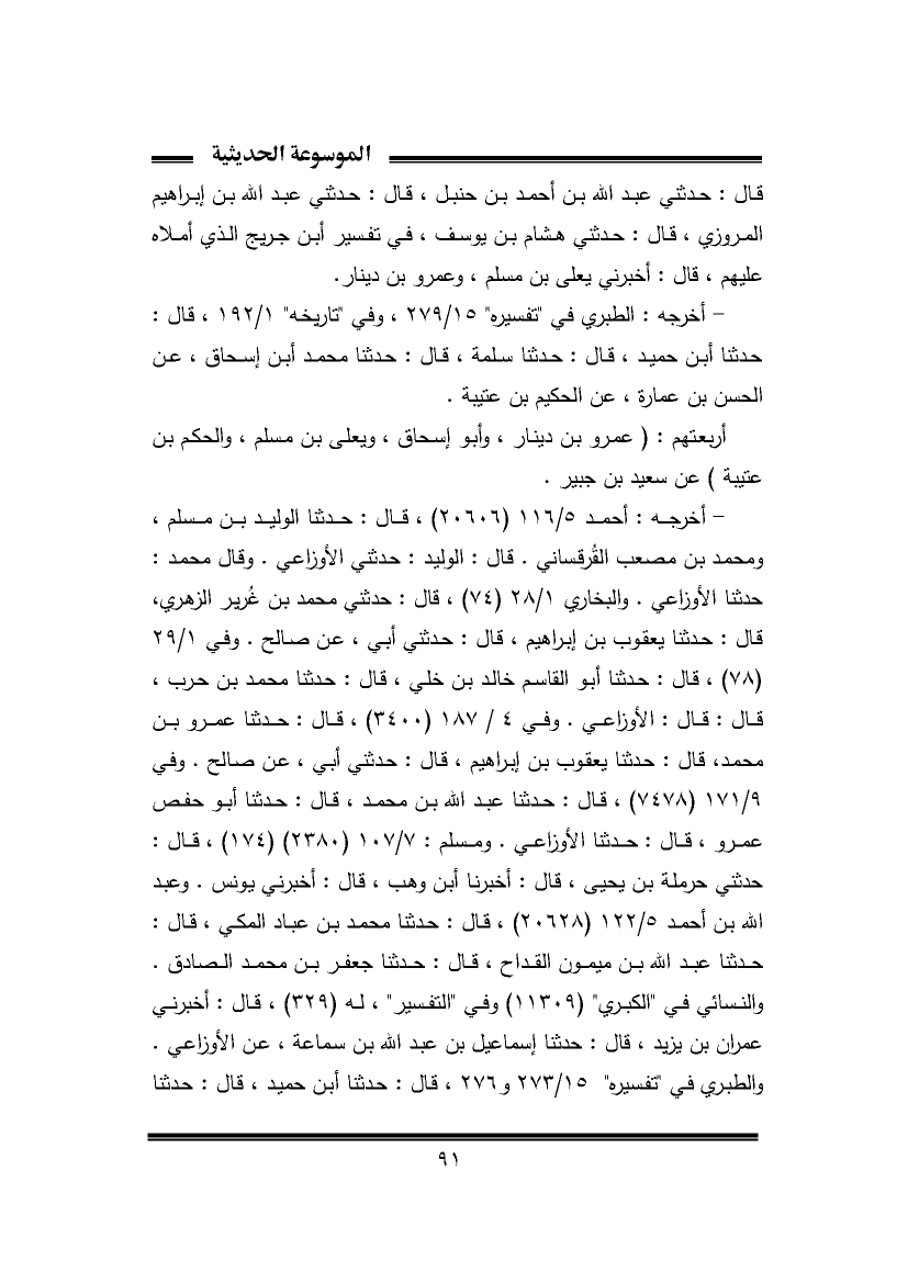 قال: حدثني عبد الله بن أحمد بن حنبل، قال: حدثني عبد الله بن إبراهيم المروزي، قال: حدثني هشام بن يوسف، في تفسير ابن جريج الذي أملاه عليهم، قال: أخبرني يعلى بن مسلم، وعمرو بن دينار.