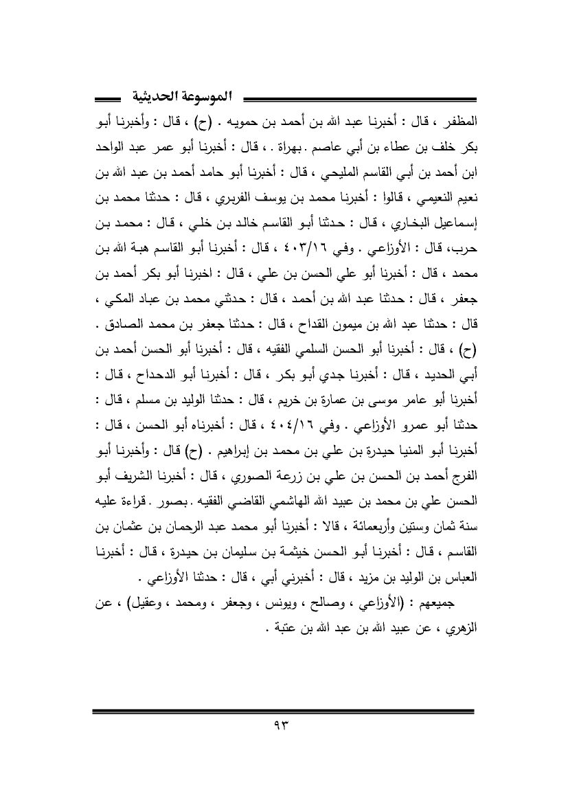 المظفر، قال: أخبرنا عبد الله بن أحمد بن حمويه. (ح)، قال: وأخبرنا أبو بكر خلف بن عطاء بن أبي عاصم. بهراة.، قال: أخبرنا أبو عمر عبد الواحد بن أحمد بن أبي القاسم المليحي، قال: أخبرنا أبو حامد أحمد بن عبد الله بن نعيم النعيمي، قالوا: أخبرنا محمد بن يوسف الفربري، قال: حدثنا محمد بن إسماعيل البخاري، قال: حدثنا أبو القاسم خالد بن خلي، قال: محمد بن حرب، قال: الأوزاعي. وفي ١٦/ ٤٠٣، قال: أخبرنا أبو القاسم هبة الله بن محمد، قال: أخبرنا أبو علي الحسن بن علي، قال: أخبرنا أبو بكر أحمد بن جعفر، قال: حدثنا عبد الله بن أحمد، قال: حدثني محمد بن عباد المكي، قال: حدثنا عبد الله بن ميمون القداح، قال: حدثنا جعفر بن محمد الصادق. (ح)، قال: أخبرنا أبو الحسن السلمي الفقيه، قال: أخبرنا أبو الحسن أحمد بن أبي الحديد، قال: أخبرنا جدي أبو بكر، قال: أخبرنا أبو الدحداح، قال: أخبرنا أبو عامر موسى بن عمارة بن خريم، قال: حدثنا الوليد بن مسلم، قال: حدثنا أبو عمرو الأوزاعي. وفي ١٦/ ٤٠٤، قال: أخبرناه أبو الحسن، قال: أخبرنا أبو المنيا حيدرة بن علي بن محمد بن إبراهيم. (ح) قال: وأخبرنا أبو الفرج أحمد بن الحسن بن علي بن زرعة الصوري، قال: أخبرنا الشريف أبو الحسن علي بن محمد بن عبيد الله الهاشمي القاضي الفقيه. بصور. قراءة عليه سنة ثمان وستين وأربعمائة، قالا: أخبرنا أبو محمد عبد الرحمان بن عثمان بن القاسم، قال: أخبرنا أبو الحسن خيثمة بن سليمان بن حيدرة، قال: أخبرنا العباس بن الوليد بن مزيد، قال: أخبرني أبي، قال: حدثنا الأوزاعي.