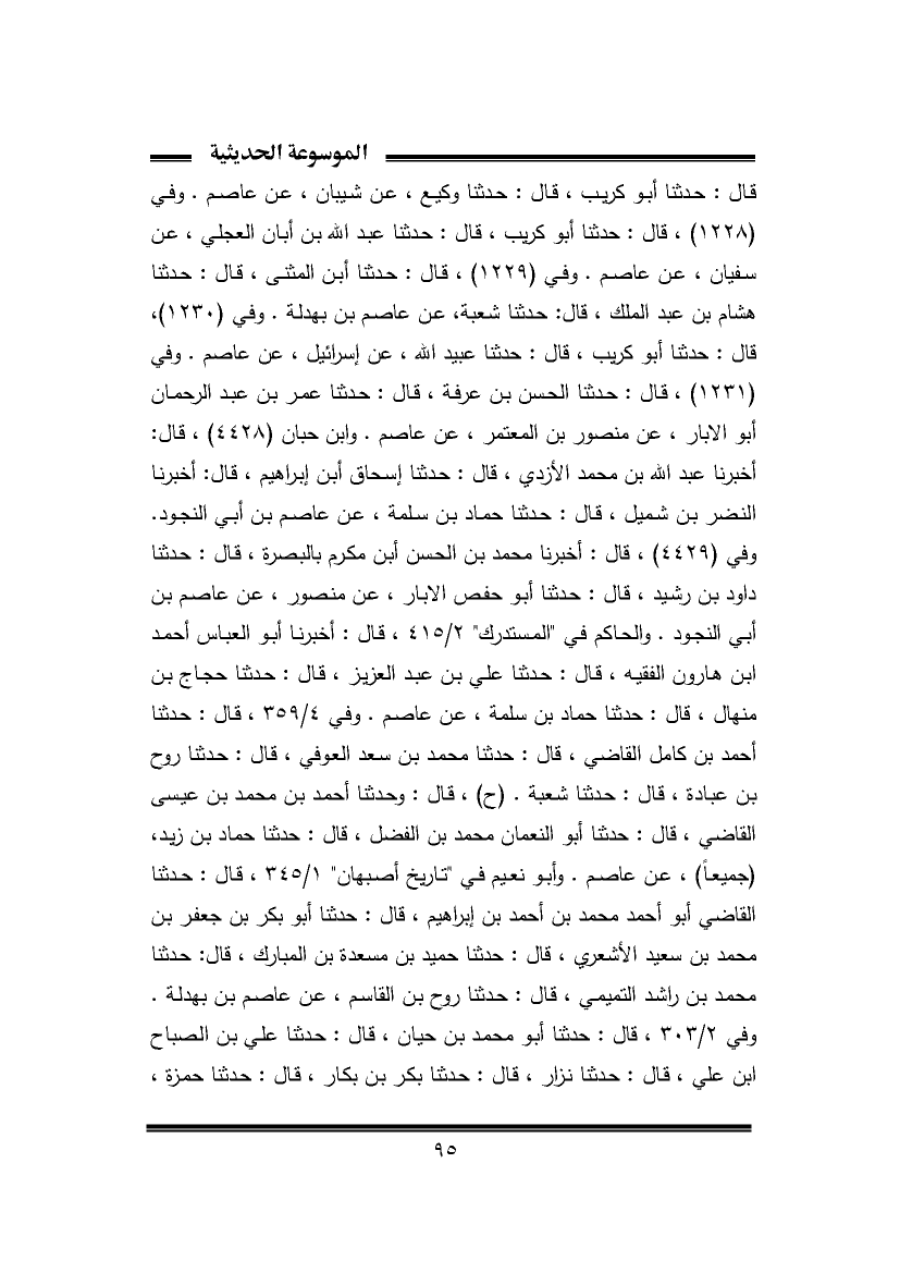 قال: حدثنا أبو كريب، قال: حدثنا وكيع، عن شيبان، عن عاصم. وفي (١٢٢٨)، قال: حدثنا أبو كريب، قال: حدثنا عبد الله بن أبان العجلي، عن سفيان، عن عاصم. وفي (١٢٢٩)، قال: حدثنا ابن المثنى، قال: حدثنا هشام بن عبد الملك، قال: حدثنا شعبة، عن عاصم بن بهدلة. وفي (١٢٣٠)، قال: حدثنا أبو كريب، قال: حدثنا عبيد الله، عن إسرائيل، عن عاصم. وفي (١٢٣١)، قال: حدثنا الحسن بن عرفة، قال: حدثنا عمر بن عبد الرحمان أبو الأبار، عن منصور بن المعتمر، عن عاصم. وابن حبان (٤٤٢٨)، قال: أخبرنا عبد الله بن محمد الأزدي، قال: حدثنا إسحاق بن إبراهيم، قال: أخبرنا النضر بن شميل، قال: حدثنا حماد بن سلمة، عن عاصم بن أبي النجود. وفي (٤٤٢٩)، قال: أخبرنا محمد بن الحسن بن مكرم بالبصرة، قال: حدثنا داود بن رشيد، قال: حدثنا أبو حفص الأبار، عن منصور، عن عاصم بن أبي النجود. والحاكم في "المستدرك" ٢/ ٤١٥، قال: أخبرنا أبو العباس أحمد بن هارون الفقيه، قال: حدثنا علي بن عبد العزيز، قال: حدثنا حجاج بن منهال، قال: حدثنا حماد بن سلمة، عن عاصم. وفي ٤/ ٣٥٩، قال: حدثنا أحمد بن كامل القاضي، قال: حدثنا محمد بن سعد العوفي، قال: حدثنا روح بن عبادة، قال: حدثنا شعبة. (ح)، قال: وحدثنا أحمد بن محمد بن عيسى القاضي، قال: حدثنا أبو النعمان محمد بن الفضل، قال: حدثنا حماد بن زيد، (جميعًا)، عن عاصم. وأبو نعيم في "تاريخ أصبهان" ١/ ٣٤٥، قال: حدثنا القاضي أبو أحمد محمد بن أحمد بن إبراهيم، قال: حدثنا أبو بكر بن جعفر بن محمد بن سعيد الأشعري، قال: حدثنا حميد بن مسعدة بن المبارك، قال: حدثنا محمد بن راشد التميمي، قال: حدثنا روح بن القاسم، عن عاصم بن بهدلة. وفي ٢/ ٣٠٣، قال: حدثنا أبو محمد بن حيان، قال: حدثنا علي بن الصباح بن علي، قال: حدثنا نزار، قال: حدثنا بكر بن بكار، قال: حدثنا حمزة،