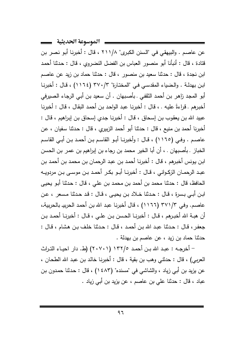 عن عاصم. والبيهقي في "السنن الكبرى" ٨/ ٢١١، قال: أخبرنا أبو نصر بن قتادة، قال: أنبأنا أبو منصور العباس بن الفضل النضروي، قال: حدثنا أحمد بن نجدة، قال: حدثنا سعيد بن منصور، قال: حدثنا حماد بن زيد عن عاصم بن بهدلة. والضياء المقدسي في "المختارة" ٣/ ٣٧٠ (١١٦٤)، قال: أخبرنا أبو المجد زاهر بن أحمد الثقفي. بأصبهان. أن سعيد بن أبي الرجاء الصيرفي أخبرهم. قراءةً عليه، قال: أخبرنا عبد الواحد بن أحمد البقال، قال: أخبرنا عبيد الله بن يعقوب بن إسحاق، قال: أخبرنا جدي إسحاق بن إبراهيم، قال: أخبرنا أحمد بن منيع، قال: حدثنا أبو أحمد الزبيري، قال: حدثنا سفيان، عن عاصم. وفي (١١٦٥)، قال: وأخبرنا أبو القاسم بن أحمد بن أبي القاسم الخباز. بأصبهان.، أن أبا الخير محمد بن رجاء بن إبراهيم بن عمر بن الحسن بن يونس أخبرهم، قال: أخبرنا أحمد بن عبد الرحمان بن محمد بن أحمد بن عبد الرحمان الزكواني، قال: أخبرنا أبو بكر أحمد بن موسى بن مردويه الحافظ، قال: حدثنا محمد بن أحمد بن محمد بن علي، قال: حدثنا أبو يحيى بن أبي بسرة، قال: حدثنا خلاد بن يحيى، قال: قد حدثنا مسعر، عن عاصم. وفي ٣/ ٣٧١ (١١٦٦)، قال أخبرنا عبد الله بن أحمد الحربي بالحربية، أن هبة الله أخبرهم، قال: أخبرنا الحسن بن علي، قال: أخبرنا أحمد بن جعفر، قال: حدثنا عبد الله بن أحمد، قال: حدثنا خلف بن هشام، قال: حدثنا حماد بن زيد، عن عاصم بن بهدلة.
