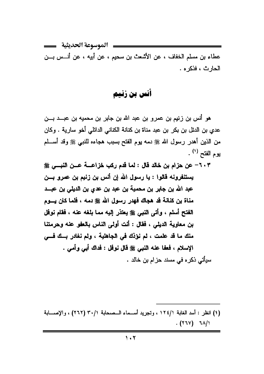 ٦٠٣ - عن حزام بن خالد قال: لما قدم ركب خزاعة عن النبي - صلى الله عليه وسلم - يستنفرونه قالوا: يا رسول الله إن أنس بن زنيم بن عمرو بن عبد الله بن جابر بن محمية بن عبد بن عدي بن الديلى بن عبد مناة بن كنانة قد هجاك فهدر رسول الله - صلى الله عليه وسلم - دمه، فلما كان يوم الفتح أسلم، وأتى النبى - صلى الله عليه وسلم - يعتذر إليه مما بلغه عنه، فقام نوفل بن معاوية الديلى، فقال: أنت أولى الناس بالعفو عنه وحرمتنا منك ما قد علمت، لم نؤذك فى الجاهلية، ولم نغادر بك فى الإسلام، فعفا عنه النبي - صلى الله عليه وسلم - قال نوفل: فداك أبى وأمي.