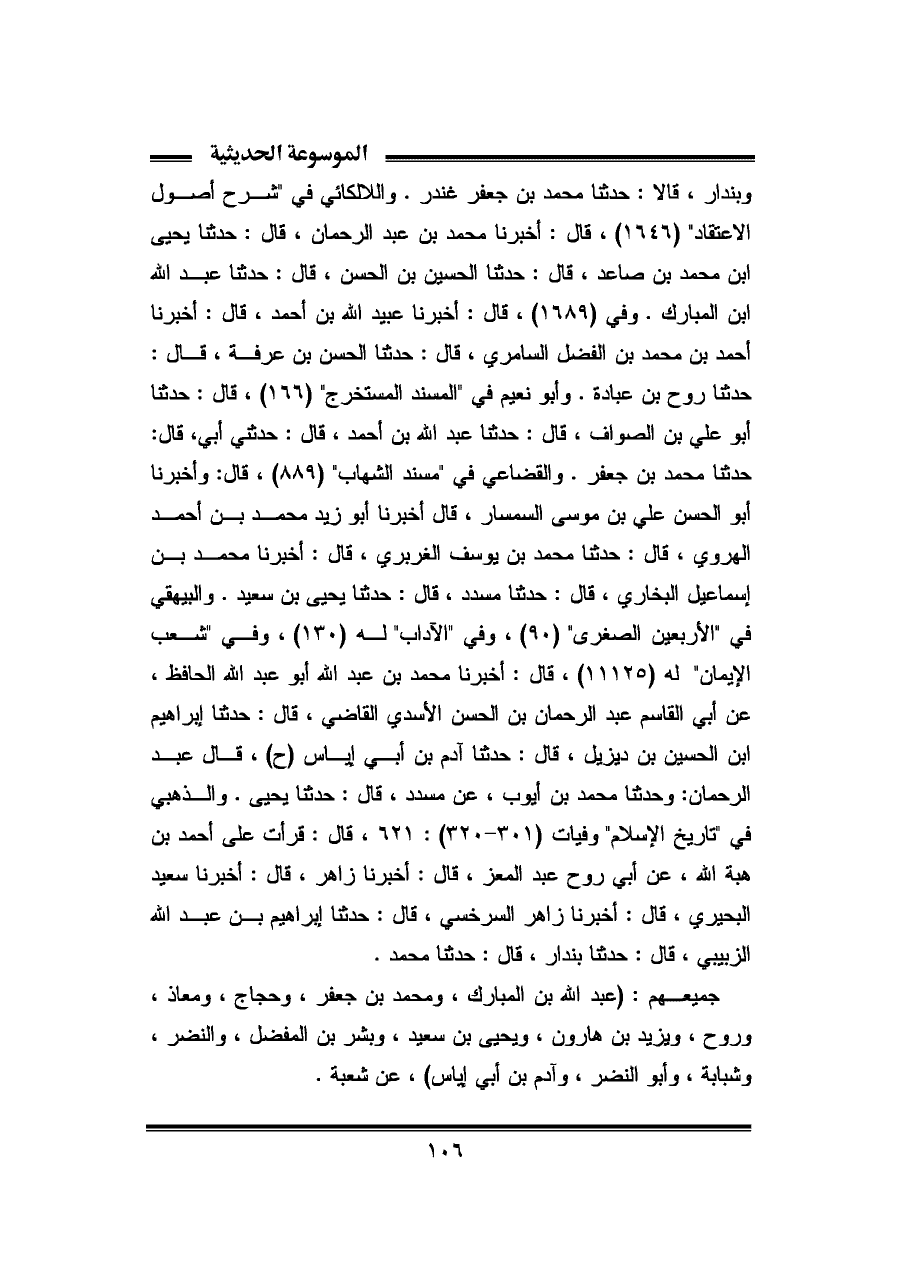 وبندار، قالا: حدثنا محمد بن جعفر غندر. واللالكائي في "شرح أصول الاعتقاد" (١٦٤٦)، قال: أخبرنا محمد بن عبد الرحمان، قال: حدثنا يحيى ابن محمد بن صاعد، قال: حدثنا الحسين بن الحسن، قال: حدثنا عبد الله ابن المبارك. وفي (١٦٨٩)، قال: أخبرنا عبيد الله بن أحمد، قال: أخبرنا أحمد بن محمد بن الفضل السامري، قال: حدثنا الحسن بن عرفة، قال: حدثنا روح بن عبادة. وأبو نعيم في "المسند المستخرج" (١٦٦)، قال: حدثنا أبو علي بن الصواف، قال: حدثنا عبد الله بن أحمد، قال: حدثني أبي، قال: حدثنا محمد بن جعفر. والقضاعي في "مسند الشهاب " (٨٨٩)، قال: وأخبرنا أبو الحسن علي بن موسى السمسار، قال أخبرنا أبو زيد محمد بن أحمد الهروي، قال: حدثنا محمد بن يوسف الغربري، قال: أخبرنا محمد بن إسماعيل البخارى، قال: حدثنا مسدد، قال: حدثنا يحيى بن سعيد. والبيهقي في "الأربعين الصغرى" (٩٠)، وفي "الآداب" له (١٣٠)، وفي "شعب الإيمان" له (١١١٢٥)، قال: أخبرنا محمد بن عبد الله أبو عبد الله الحافظ، عن أبي القاسم عبد الرحمان بن الحسن الأسدي القاضي، قال: حدثنا إبراهيم ابن الحسين بن ديزيل، قال: حدثنا أدم بن أبي إياس (ح)، قال عبد الرحمان: وحدثنا محمد بن أيوب، عن مسدد، قال: حدثنا يحيى. والذهبي في "تاريخ الإسلام" وفيات (٣٠١ - ٣٢٠): ٦٢١، قال: قرأت على أحمد بن هبة الله، عن أبي روح عبد المعز، قال: أخبرنا زاهر، قال: أخبرنا سعيد البحيري، قال: أخبرنا زاهر السرخسي، قال: حدثنا إبراهيم بن عبد الله الزبيبي، قال: حدثنا بندار، قال: حدثنا محمد.