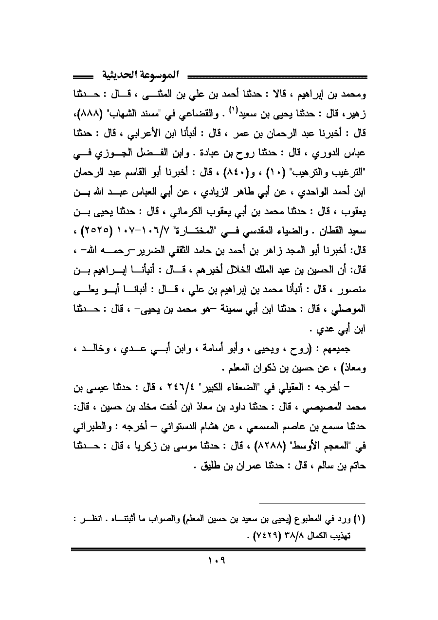 (¬١) ورد في المطبوع (يحيى بن سعيد بن حسين المعلم) والصواب ما أثبتناه. انظر: تهذيب الكمال ٨/ ٣٨ (٧٤٢٩).