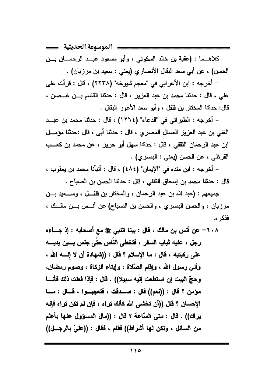 ٦٠٨ - عن أنس بن مالك، قال: بينا النبي -صلى الله عليه وسلم- مع أصحابه: إذ جاءه رجل، عليه ثياب السفر، فتخطى النّاس حتّى جلس بين يديه على ركبتيه، قال: ما الإسلام؟ قال: "شهادة أن لا إله الله، وأنى رسول اللّه، وإقام الصّلاة، وإيتاء الزكاة، وصوم رمضان، وحجّ البيت إن استطعت إلَيه سبيلا". قال: فإذا فعلت ذلك فأنا مؤمن؟ قال: ((نعم)) قال: صدقت، فتعجبوا، قال: ما الإحسان؟ قال ((أن تخشى اللّه كأنك تراه، فإن لم تكن تراه فإنه يراك)). قال: متى السّاعة؟ قال: ((ما المسؤول عنها بأعلم من السائل، ولكن لها أشراط)) فقام، فقال: ((عليّ بالرجل))