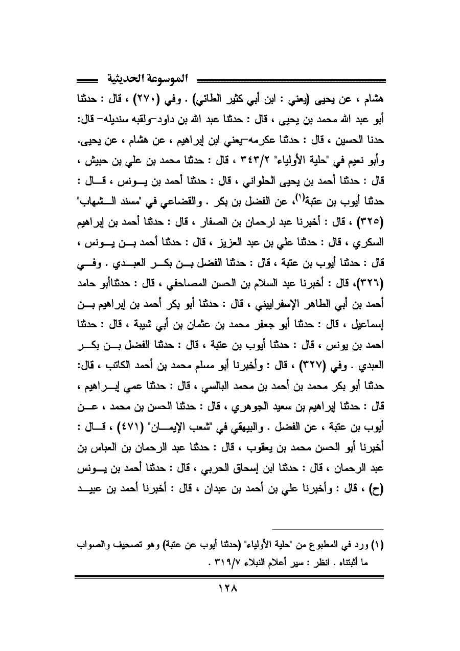هشام، عن يحيى (يعني: ابن أبي كثير الطائي). وفي (٢٧٠)، قال: حدثنا أبو عبد الله محمد بن يحيى، قال: حدثنا عبد الله بن داود -ولقبه سنديله- قال: حدثنا الحسين، قال: حدثنا عكرمة يعنى ابن إبراهيم، عن هشام، عن يحيى. وأبو نعيم في "حلية الأولياء" ٢/ ٣٤٣، قال: حدثنا محمد بن علي بن حبيش، قال: حدثنا أحمد بن يحيى الحلواني، قال: حدثنا أحمد بن يونس، قال: حدثنا أيوب بن عتبة (¬١)، عن الفضل بن بكر. والقضاعي في "مسند الشهاب" (٣٢٥)، قال: أخبرنا عبد الرحمان بن الصفار، قال: حدثنا أحمد بن إبراهيم السكري، قال: حدثنا علي بن عبد العزيز، قال: حدثنا أحمد بن يونس، قال: حدثنا أيوب بن عتبة، قال: حدثنا الفضل بن بكر العبدي. وفي (٣٢٦)، قال: أخبرنا عبد السلام بن الحسن المصاحفي، قال: حدثنا أبو حامد أحمد بن أبي الطاهر الإسفراييني، قال: حدثنا أبو بكر أحمد بن إبراهيم بن إسماعيل، قال: حدثنا أبو جعفر محمد بن عثمان بن أبي شيبة، قال: حدثنا أحمد بن يونس، قال: حدثنا أيوب بن عتبة، قال: حدثنا الفضل بن بكر العبدي. وفي (٣٢٧)، قال: وأخبرنا أبو مسلم محمد بن أحمد الكاتب، قال: حدثنا أبو بكر محمد بن أحمد بن محمد البالسي، قال: حدثنا عمي إبراهيم، قال: حدثنا إبراهيم بن سعيد الجوهري، قال: حدثنا الحسن بن محمد، عن أيوب بن عتبة، عن الفضل. والبيهقي في "شعب الإيمان" (٤٧١)، قال: أخبرنا أبو الحسن محمد بن يعقوب، قال: حدثنا عبد الرحمان بن العباس بن عبد الرحمان، قال: حدثنا ابن إسحاق الحربي، قال: حدثنا أحمد بن يونس (ح)، قال: وأخبرنا علي بن أحمد بن عبدان، قال: أخبرنا أحمد بن عبيد