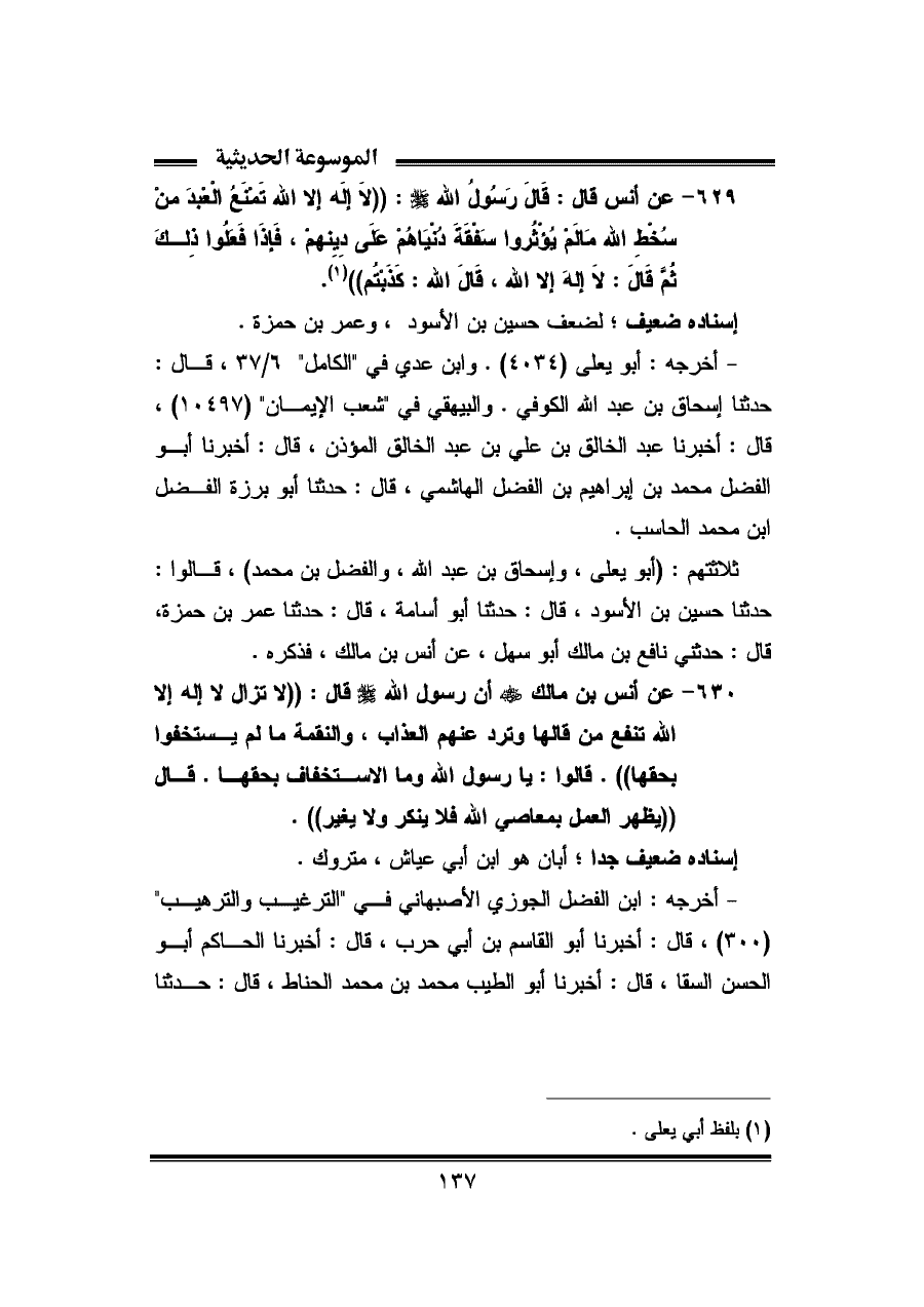 - أخرجه: أبو يعلى (٤٠٣٤). وابن عدي في "الكامل" ٦/ ٣٧، قال: حدثنا إسحاق بن عبد الله الكوفي. والبيهقي في "شعب الإيمان" (١٠٤٩٧)، قال: أخبرنا عبد الخالق بن علي بن عبد الخالق المؤذن، قال: أخبرنا أبو الفضل محمد بن إبراهيم بن الفضل الهاشمي، قال: حدثنا أبو برزة الفضل ابن محمد الحاسب.