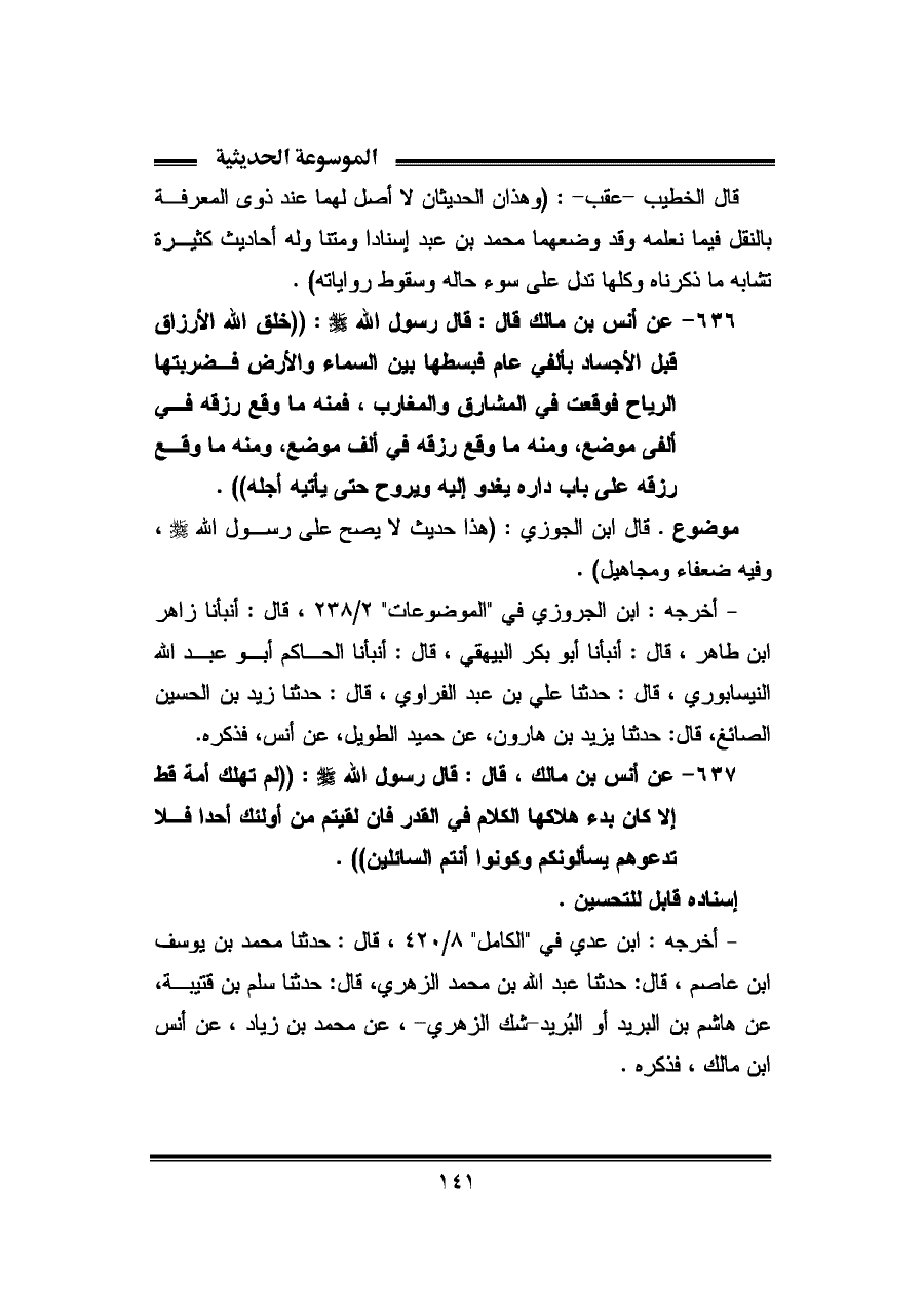 قال الخطيب -عقب-: (وهذان الحديثان لا أصل لهما عند ذوى المعرفة بالنقل فيما نعلمه وقد وضعهما محمد بن عبد إسنادا ومتنا وله أحاديث كثيرة تشابه ما ذكرناه وكلها تدل على سوء حاله وسقوط رواياته).
