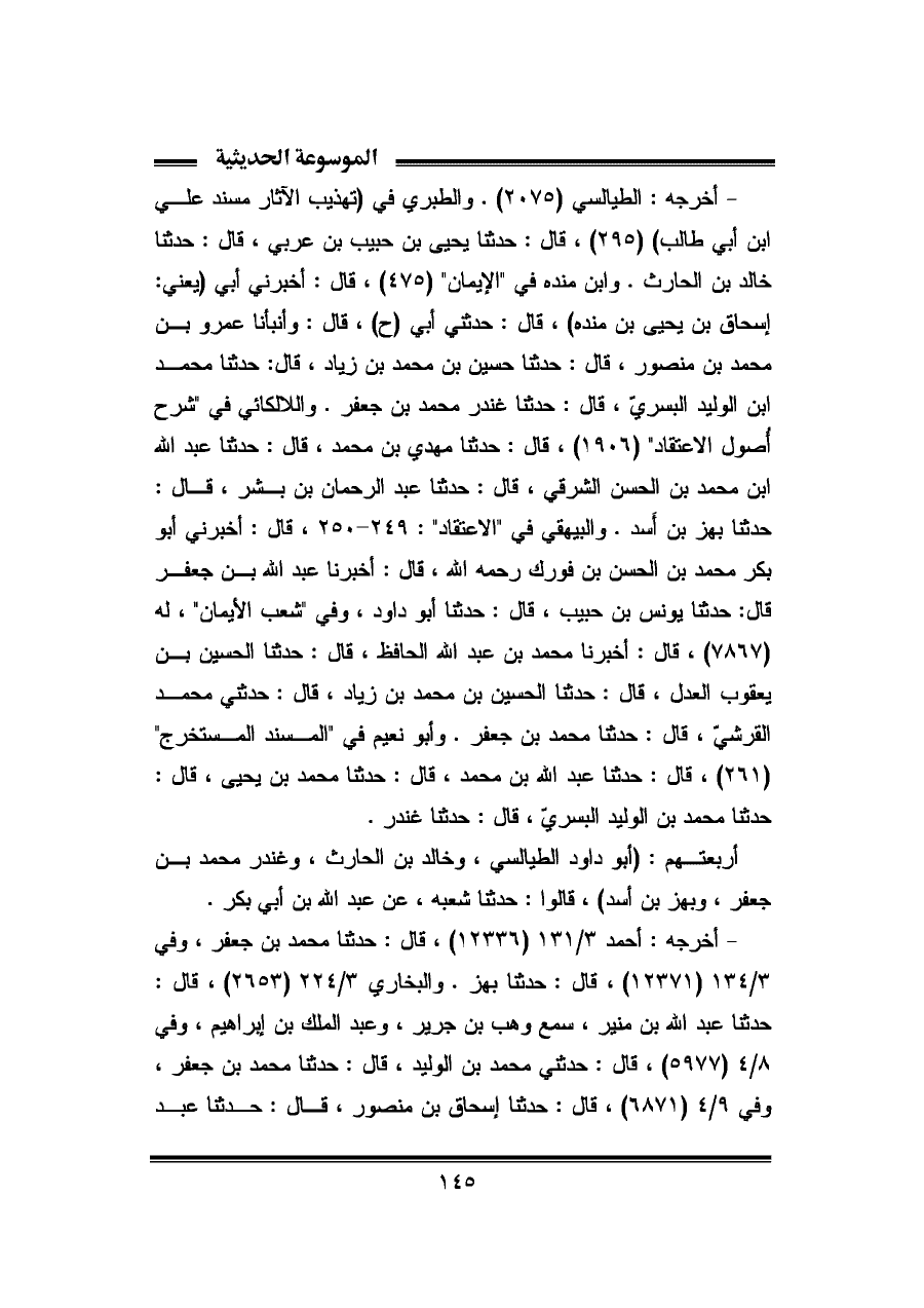 - أخرجه: الطيالسي (٢٠٧٥). والطبري في (تهذيب الآثار مسند علي ابن أبي طالب) (٢٩٥)، قال: حدثنا يحيى بن حبيب بن عربي، قال: حدثنا خالد بن الحارث. وابن منده في "الإيمان" (٤٧٥)، قال: أخبرني أبي (يعني: إسحاق بن يحيى بن منده)، قال: حدثني أبي (ح)، قال: وأنبأنا عمرو بن محمد بن منصور، قال: حدثنا حسين بن محمد بن زياد، قال: حدثنا محمد ابن الوليد البسريّ، قال: حدثنا غندر محمد بن جعفر. واللالكائي في "شرح أصول الاعتقاد" (١٩٠٦)، قال: حدثنا مهدى بن محمد، قال: حدثنا عبد الله ابن محمد بن الحسن الشرقي، قال: حدثنا عبد الرحمان بن بشر، قال: حدثنا بهز بن أسد. والبيهقي في "الاعتقاد": ٢٤٩ - ٢٥٠، قال: أخبرني أبو بكر محمد بن الحسن بن فورك رحمه الله، قال: أخبرنا عبد الله بن جعفر قال: حدثنا يونس بن حبيب، قال: حدثنا أبو داود، وفي "شعب الإيمان"، له (٧٨٦٧)، قال: أخبرنا محمد بن عبد الله الحافظ، قال: حدثنا الحسين بن يعقوب العدل، قال: حدثنا الحسين بن محمد بن زياد، قال: حدثني محمد القرشيّ، قال: حدثنا محمد بن جعفر. وأبو نعيم في "المسند المستخرج" (٢٦١)، قال: حدثنا عبد الله بن محمد، قال: حدثنا محمد بن يحيى، قال: حدثنا محمد بن الوليد البسريّ، قال: حدثنا غندر.