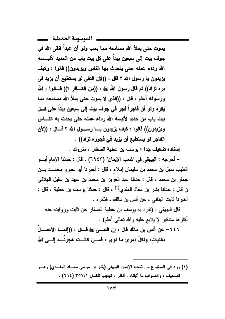 - أخرجه: البيهقي في "شعب الإيمان" (٦٩٤٣)، قال: حدثنا الإمام أبو الطيب سهل بن محمد بن سليمان إملاءٍ، قال: أخبرنا أبو عمرو محمد بن جعفر بن محمد، قال: حدثنا عبد العزيز بن محمد بن عبيد بن عقيل الهلالي ن قال: حدثنا بشر بن معاذ العقدى (¬١)، قال: حدثنا يوسف بن عطية، قال: أخبرنا ثابت البناني، عن أنس بن مالك، فذكره.