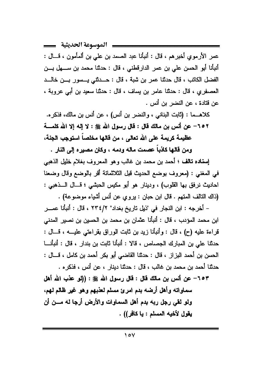 ٦٥٣ - عن أنس بن مالك قال: قال رسول اللّه -صلى الله عليه وسلم-: ((لو عذّب اللّه أهل سماواته وأهل أرضه بدم امرئٍ مسلم لعذبهم وهو غير ظالم لهم، ولو لقى رجل ربه بدم أهل السماوات والاًرض أرجا له من أن يقول لأخيه المسلم: يا كافر)).