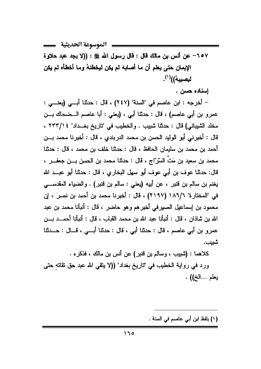 ٦٥٧ - عن أنس بن مالك قال: قال رسول الله - صلى الله عليه وسلم -: "لا يجد عبد حلاوة الإيمان حتى يعلم أن ما أصابه لم يكن ليخطئهُ وما أخطأه لم يكن ليصيبهُ" (¬١).