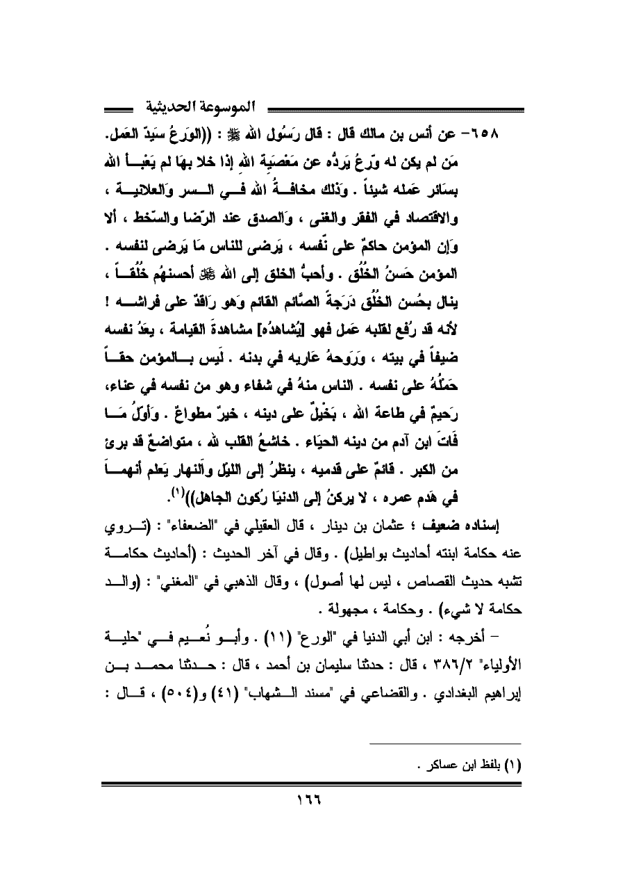 ٦٥٨ - عن أنس بن مالك قال: قال رَسُول الله - صلى الله عليه وسلم -: "الوَرعُ سَيدّ العَمل. مَن لم يكن له ورعُ يردُّه عن مَعْصيَة اللّهِ إذا خلا بهَا لم يعْبأ الله بسَائر عَمله شيئًا. وَذلك مخافةُ الله في السر وَالعلانية، والإقتصاد في الفقر والغنى، وَالصدق عند الرّضا والسّخط، ألا وَإن المؤمن حاكم على نّفسه، يرضى للناس مَا يرضى لنفسه. المؤمن حَسنُ الخُلُق. واحبُّ الخلق إلى الله عز وجل أحسنهُم خُلُقًا، ينال بحُسن الخُلُقِ دَرَجة الصَّائم القائم وَهو رَاقدٌ على فراشه! لأنه قد رُفع لقلبه عَمل فهو [يُشاهدُه] مشاهدةَ القيامة، يعَدُ نفسه ضيفًا في بيته، وَرَوحهُ عَاريه في بدنه. لَيس بالمؤمن حقًا حَملُهُ على نفسه. الناس منهُ في شفاء وهو من نفسه في عناء، رَحيمٌ في طاعة الله، بَخْيل على دينه، خيرٌ مطواعٌ. وَأوّلُ مَا فَاتَ ابن آدم من دينه الحيَاء. خاشعُ القلب للّه، متواضعٌ قد برئ من الكبر. قائم على قدميه، ينظرُ إلى الليل والنهار يَعلم أنهما في هَدم عمره، لا يركنُ إلى الدنيا رُكون الجاهل" (¬١).