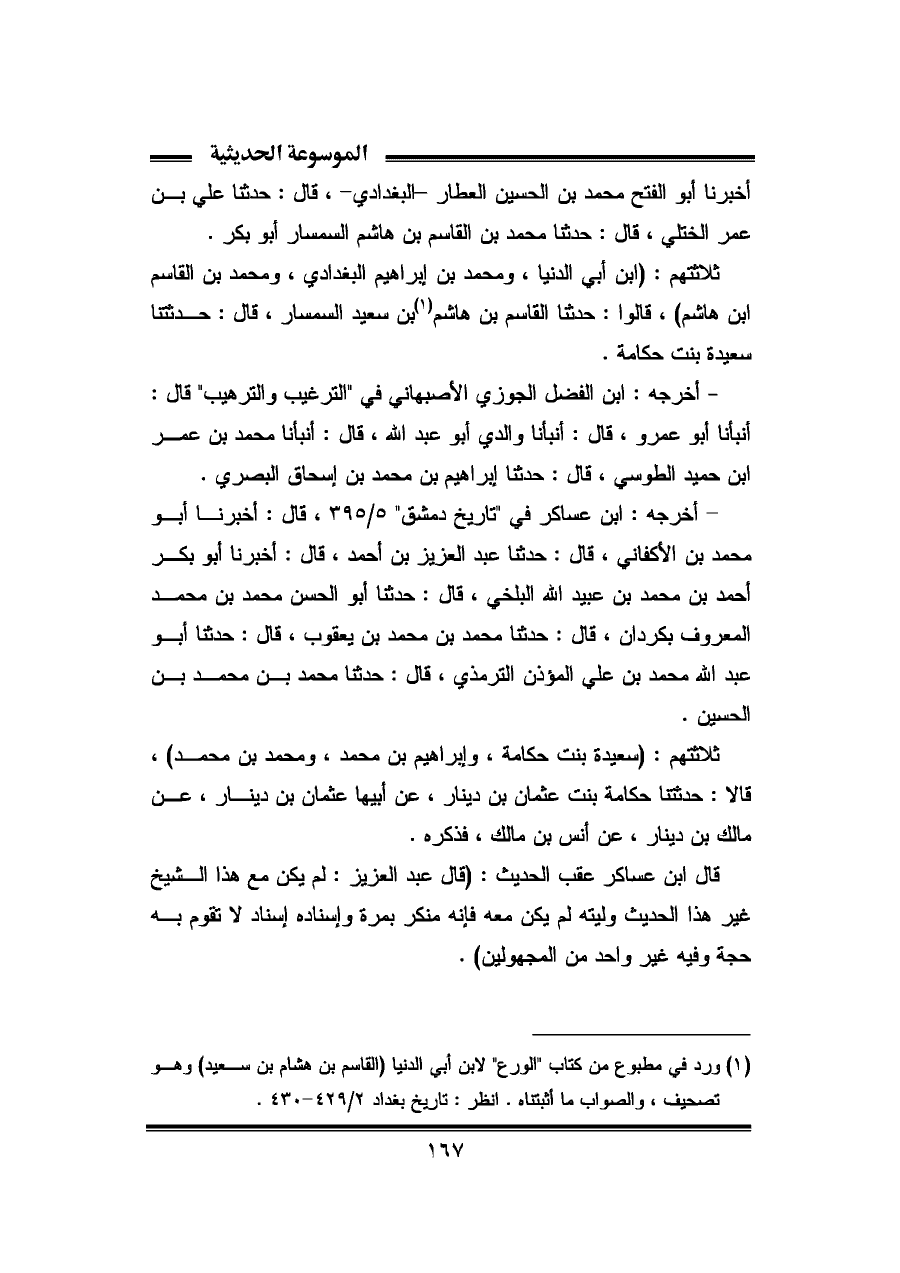 ثلاثتهم: (سعيدة بنت حكامة، وإبراهيم بن محمد، ومحمد بن محمد)، قالا: حدثتنا حكامة بنت عثمان بن دينار، عن أبيها عثمان بن دينار، عن مالك بن دينار، عن أنس بن مالك، فذكره.
