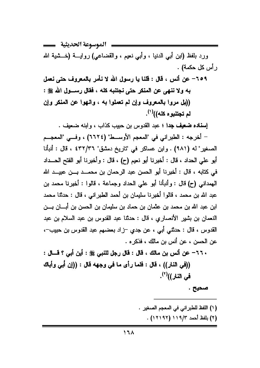 ٦٥٩ - عن أنس، قال: قلنا يا رسول الله لا نأمر بالمعروف حتى نعمل به ولا ننهى عن المنكر حنى نجتنبه كله، فقال رسول الله - صلى الله عليه وسلم -: "بل مروا بالمعروف وإن لم تعملوا به، وانهوا عن المنكر وإن لم تجتنبوه كله" (¬١).