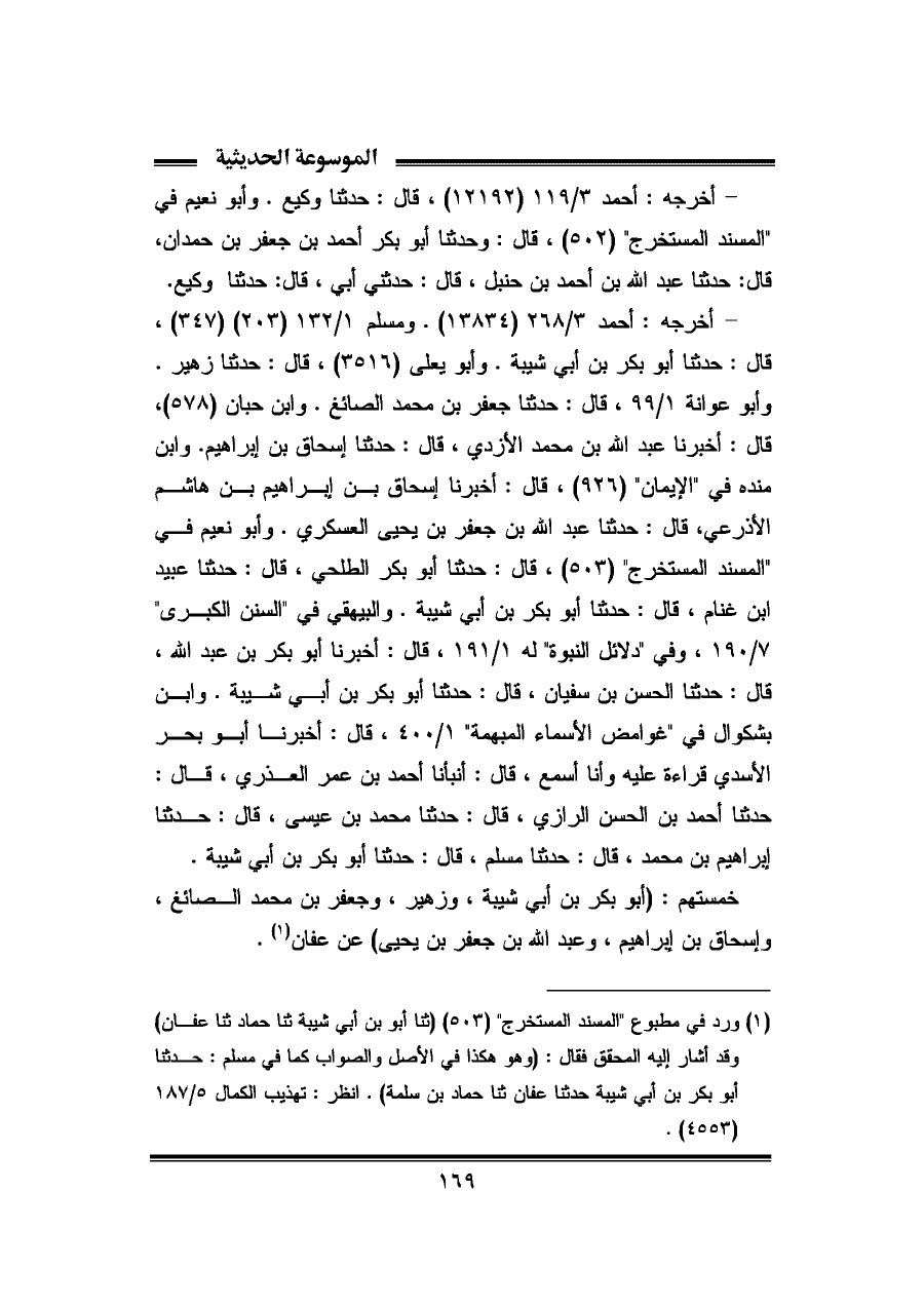 (¬١) ورد في مطبوع "المسند المستخرج" (٥٠٣) (ثنا أبو بن أبي شيبة ثنا حماد ثنا عفان) وقد أشار إليه المحقق فقال: (وهو هكذا في الأصل والصواب كما في مسلم: حدثنا أبو بكر بن أبي شيبة حدثنا عفان ثنا حماد بن سلمة). انظر: تهذيب الكمال ٥/ ١٨٧ (٤٥٥٣).