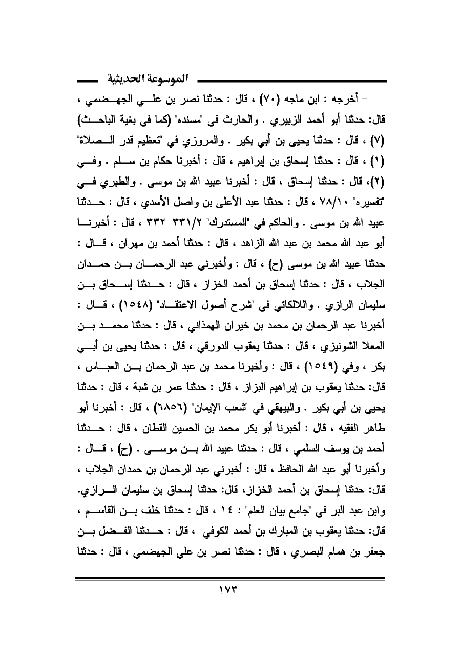 - أخرجه: ابن ماجه (٧٠)، قال: حدثنا نصر بن علي الجهضمي، قال: حدثنا أبو أحمد الزبيري. والحارث في "مسنده" (كما في بغية الباحث) (٧)، قال: حدثنا يحيى بن أبي بكير. والمروزي في "تعظيم قدر الصلاة" (١)، قال: حدثنا إسحاق بن إبراهيم، قال: أخبرنا حكام بن سلم. وفي (٢)، قال: حدثنا إسحاق، قال: أخبرنا عبيد الله بن موسى. والطبري في "تفسيره" ١٠/ ٧٨، قال: حدثنا عبد الأعلى بن واصل الأسدي، قال: حدثنا عبيد الله بن موسى. والحاكم في "المستدرك" ٢/ ٣٣١ - ٣٣٢، قال: أخبرنا أبو عبد الله محمد بن عبد الله الزاهد، قال: حدثنا أحمد بن مهران، قال: حدثنا عبيد الله بن موسى (ح)، قال: وأخبرني عبد الرحمان بن حمدان الجلاب، قال: حدثنا إسحاق بن أحمد الخزاز، قال: حدثنا إسحاق بن سليمان الرازي. والمكائي في "شرح أصول الاعتقاد" (١٥٤٨)، قال: أخبرنا عبد الرحمان بن محمد بن خيران الهمذاني، قال: حدثنا محمد بن المعلا الشونيزي، قال: حدثنا يعقوب الدورقي، قال: حدثنا يحيى بن أبي بكر، وفي (١٥٤٩)، قال: وأخبرنا محمد بن عبد الرحمان بن العباس، قال: حدثنا يعقوب بن إبراهيم البزاز، قال: حدثنا عمر بن شبة، قال: حدثنا يحيى بن أبي بكير. والبيهقي في "شعب الإيمان" (٦٨٥٦)، قال: أخبرنا أبو طاهر الفقيه، قال: أخبرنا أبو بكر محمد بن الحسين القطان، قال: حدثنا أحمد بن يوسف السلمي، قال: حدثنا عبيد الله بن موسى. (ح)، قال: وأخبرنا أبو عبد الله الحافظ، قال: أخبرني عبد الرحمان بن حمدان الجلاب، قال: حدثنا إسحاق بن أحمد الخزاز، قال: حدثنا إسحاق بن سليمان الرازي. وابن عبد البر في "جامع بيان العلم": ١٤، قال: حدثنا خلف بن القاسم، قال: حدثنا يعقوب بن المبارك بن أحمد الكوفي، قال: حدثنا الفضل بن جعفر بن همام البصري، قال: حدثنا نصر بن علي الجهضمي، قال: حدثنا