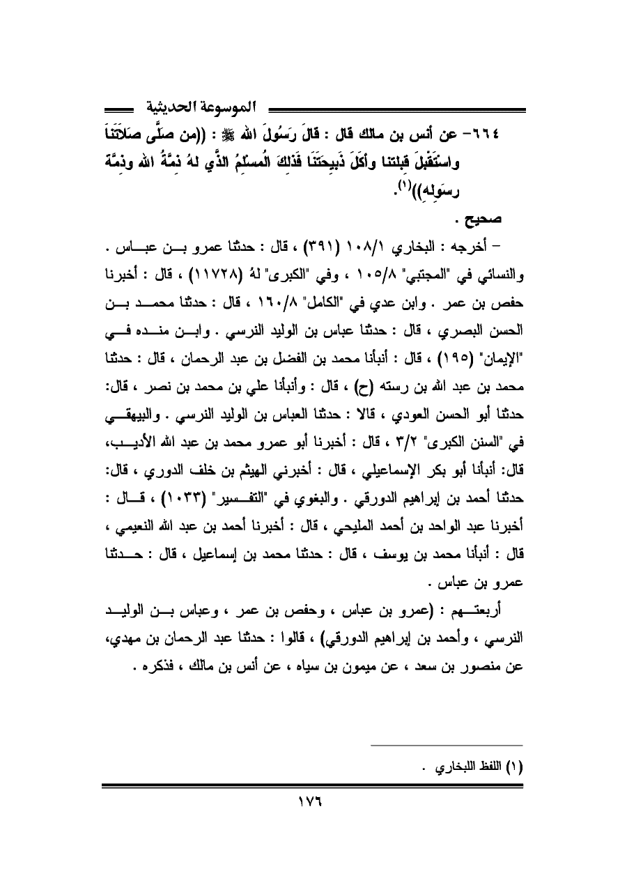 ٦٦٤ - عن أنس بن مالك قال: قالَ رَسُولَ الله - صلى الله عليه وسلم -: "من صلَّى صَلَاتَنَا واسْتَقبلَ قبلتنا وأكَلَ ذَبيحتَنَا فَذلكَ المُسْلِمُ الذَّي لهُ ذِمَّةُ الله وذِمَّة رسَوِلهِ" (¬١).