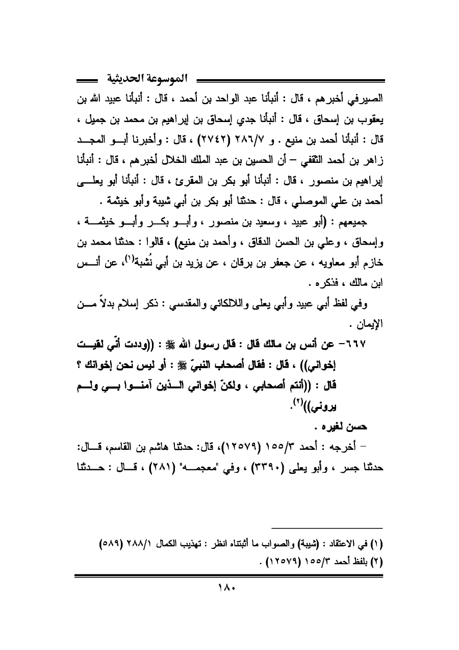 ٦٦٧ - عن أنس بن ملك قال: قال رسول الله - صلى الله عليه وسلم -: "وددت أنّى لقيت إخوانى"، قال: فقال أصحاب النبيّ - صلى الله عليه وسلم -: أَو ليس نحن إخوانك؟ قال: "أنتم أصحابي، ولكنّ إخوانى الذين أمنوا بى ولم يرونى" (¬٢).