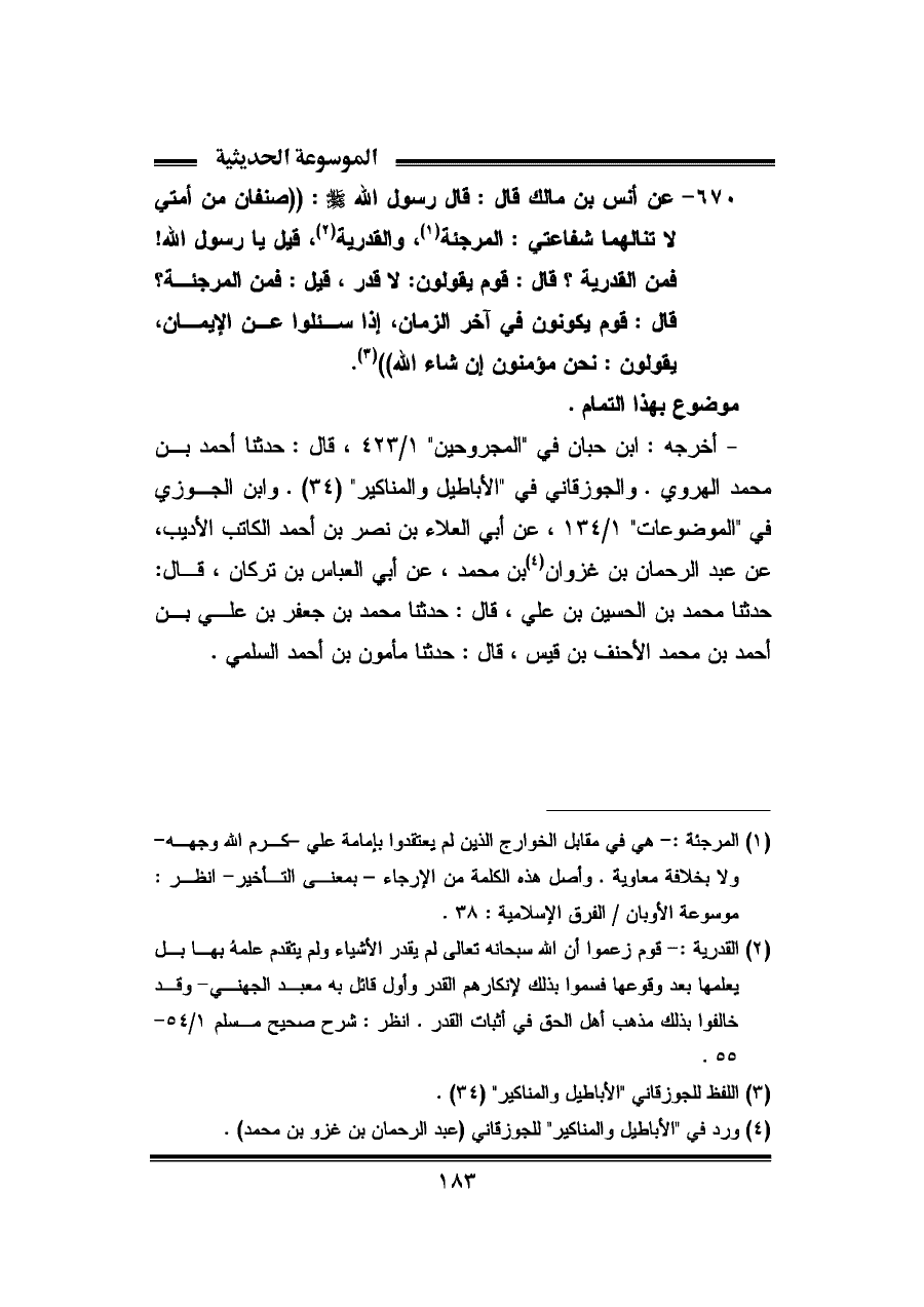 (¬٤) ورد في "الأباطيل والمناكير" للجوزقاني (عبد الرحمان بن غزو بن محمد).
