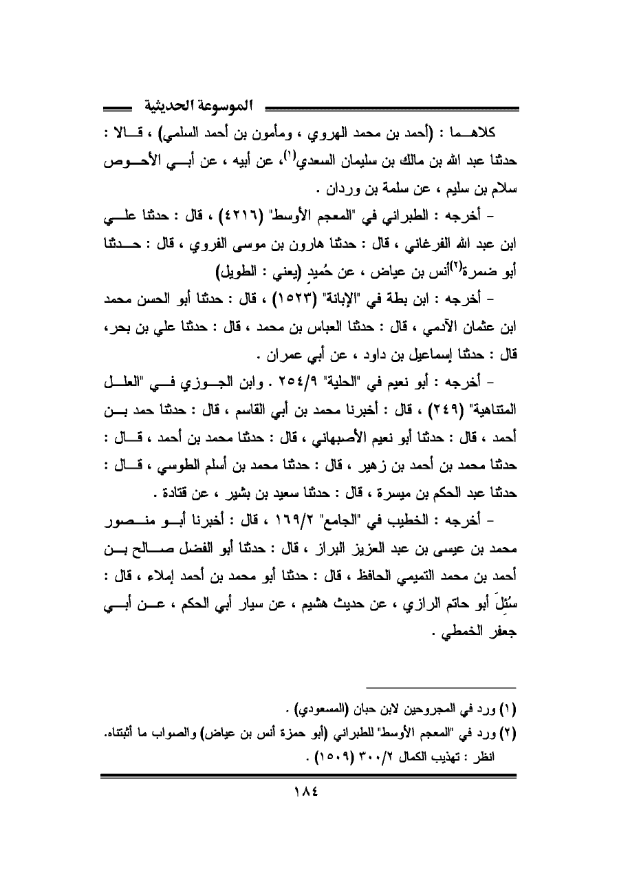 (¬٢) ورد في "المعجم الأوسط" للطبراني (أبو حمزة أنس بن عياض) والصواب ما أثبتناه.