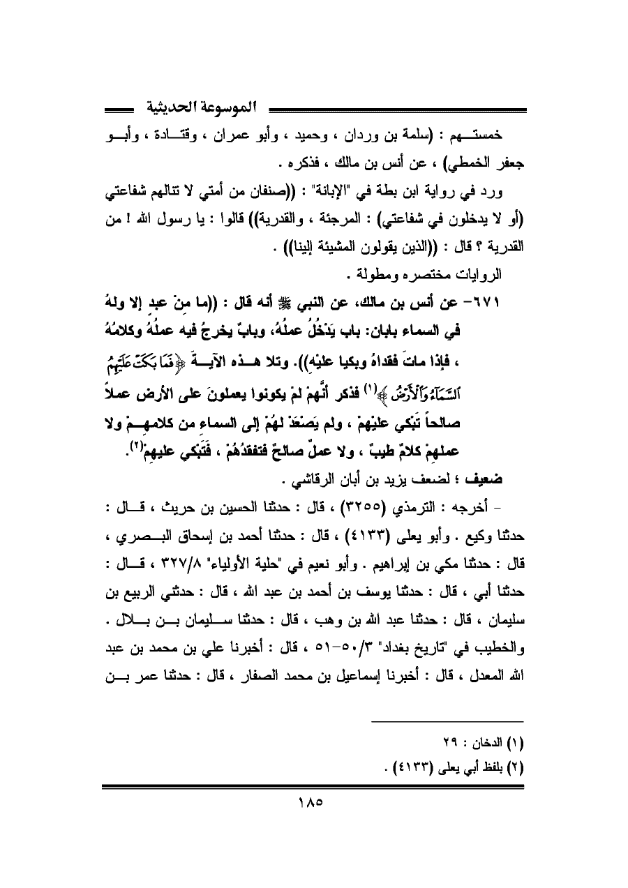 ٦٧١ - عن أنس بن مالك، عن النبي - صلى الله عليه وسلم - أنه قال: "ما مِنْ عبدٍ إلا ولهُ في السماء بابان: باب يدْخُلُ عملُهُ، وبابٌ يخرجُ فيه عملُهُ وكلامُهُ، فإذا ماتَ فقداهُ وبكيا عليهِ". وتلا هذه الآيةَ {فَمَا بَكَتْ عَلَيْهِمُ السَّمَاءُ وَالْأَرْضُ} (¬١) فذكر أنَّهم لمْ يكونوا يعملونَ على الأرض عملًا صالحًا تَبْكى عليهمْ، ولم يصْعد لهُمْ إلى السماءِ من كلامهِمْ ولا عملهِمْ كلام طيبٌ، ولا عمل صالحٌ فتفقدُهُمْ، فَتَبْكى عليهِمْ (¬٢).