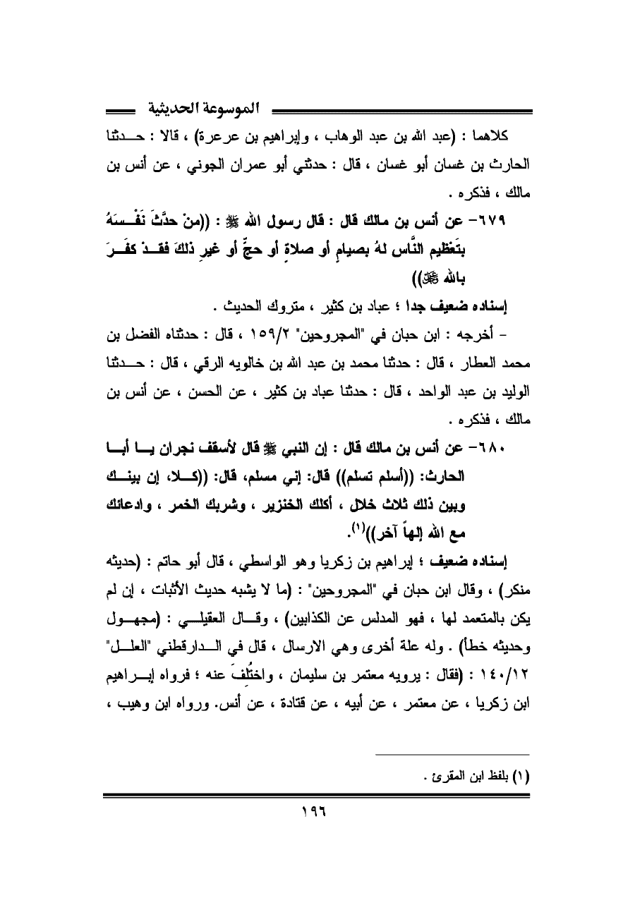 - أخرجه: ابن حبان في "المجروحين" ٢/ ١٥٩، قال: حدثناه الفضل بن محمد العطار، قال: حدثنا محمد بن عبد الله بن خالويه الرقي، قال: حدثنا الوليد بن عبد الواحد، قال: حدثنا عباد بن كثير، عن الحسن، عن أنس بن مالك، فذكره.